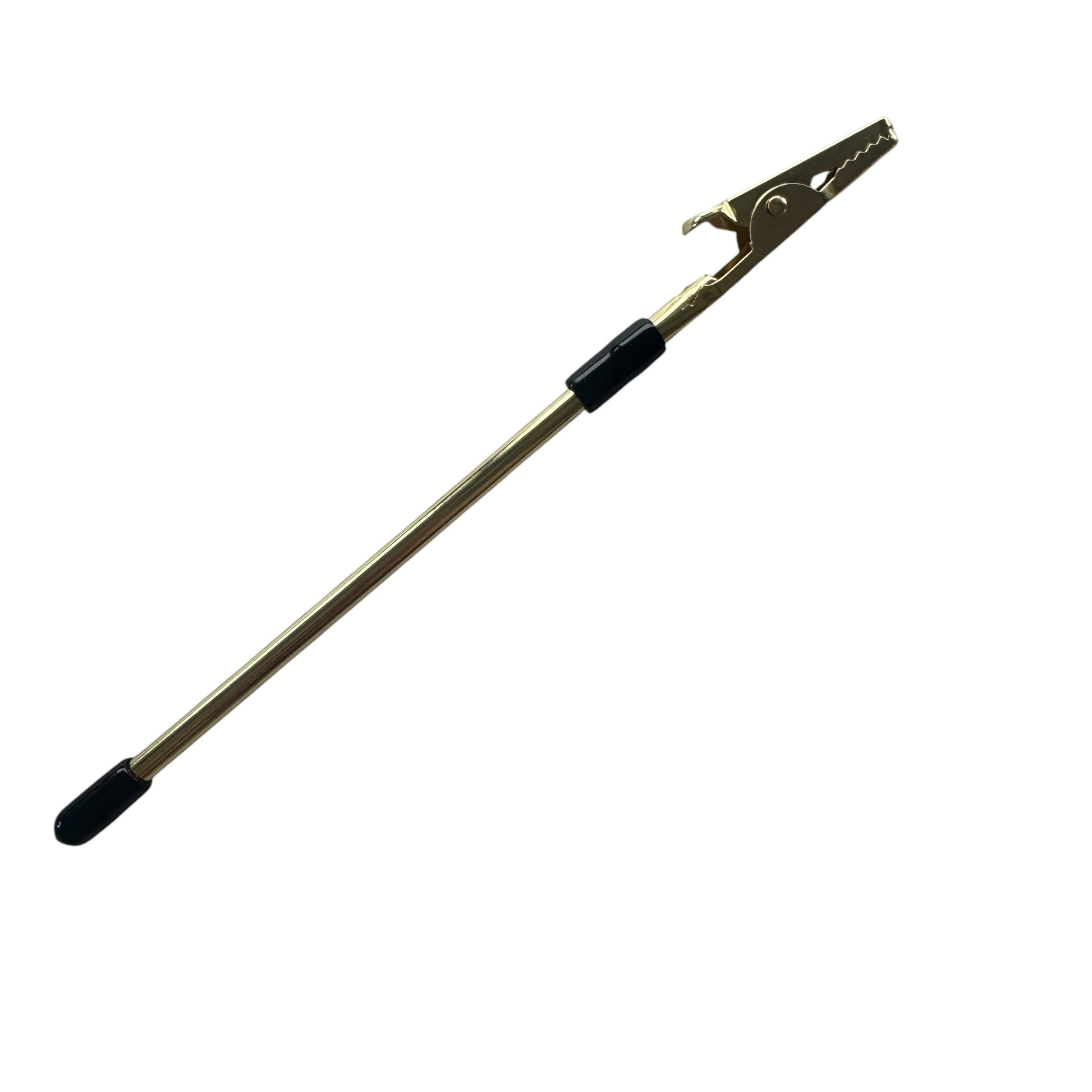 Image Description: A slim metal rod with a crocodile-style clip on one end and a soft black silicone cap on the other. The clip holds one end of your jewellery steady so you can fasten it with your free hand. Shown in silver, gold, and rose gold, alongside step-by-step images demonstrating how it’s used to fasten a bracelet. Available in: Silver, gold, and rose gold.