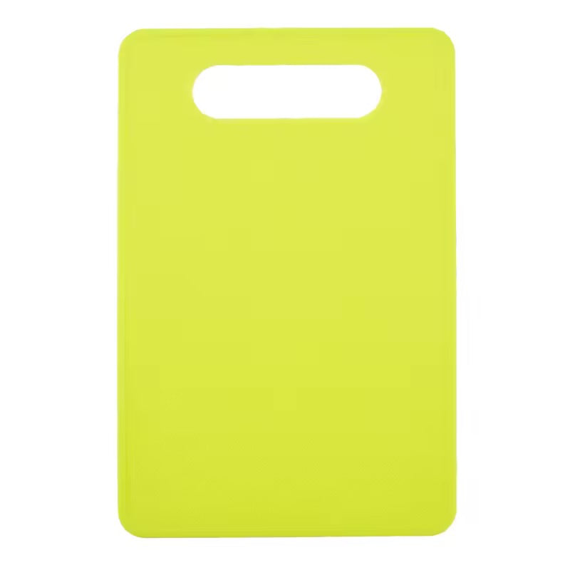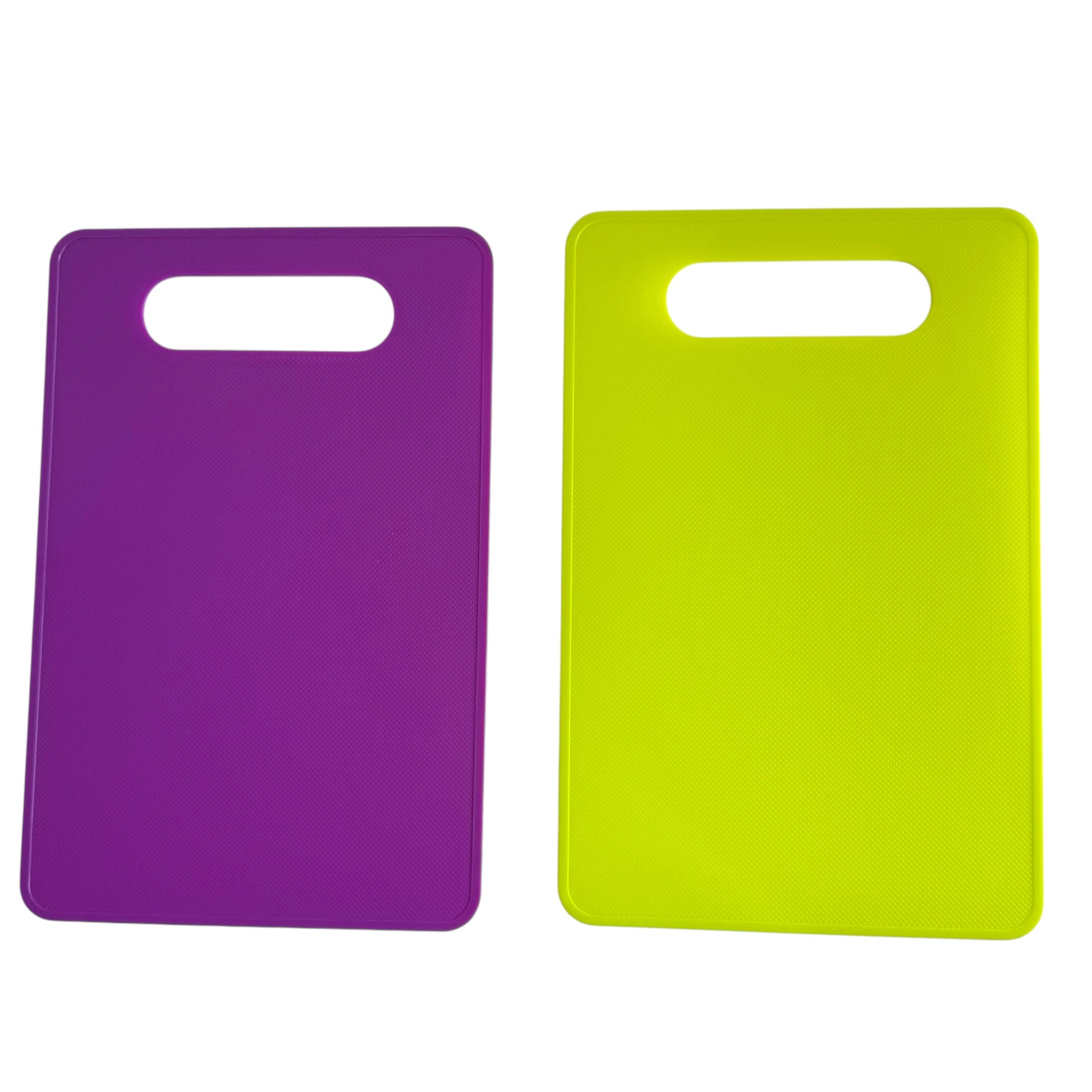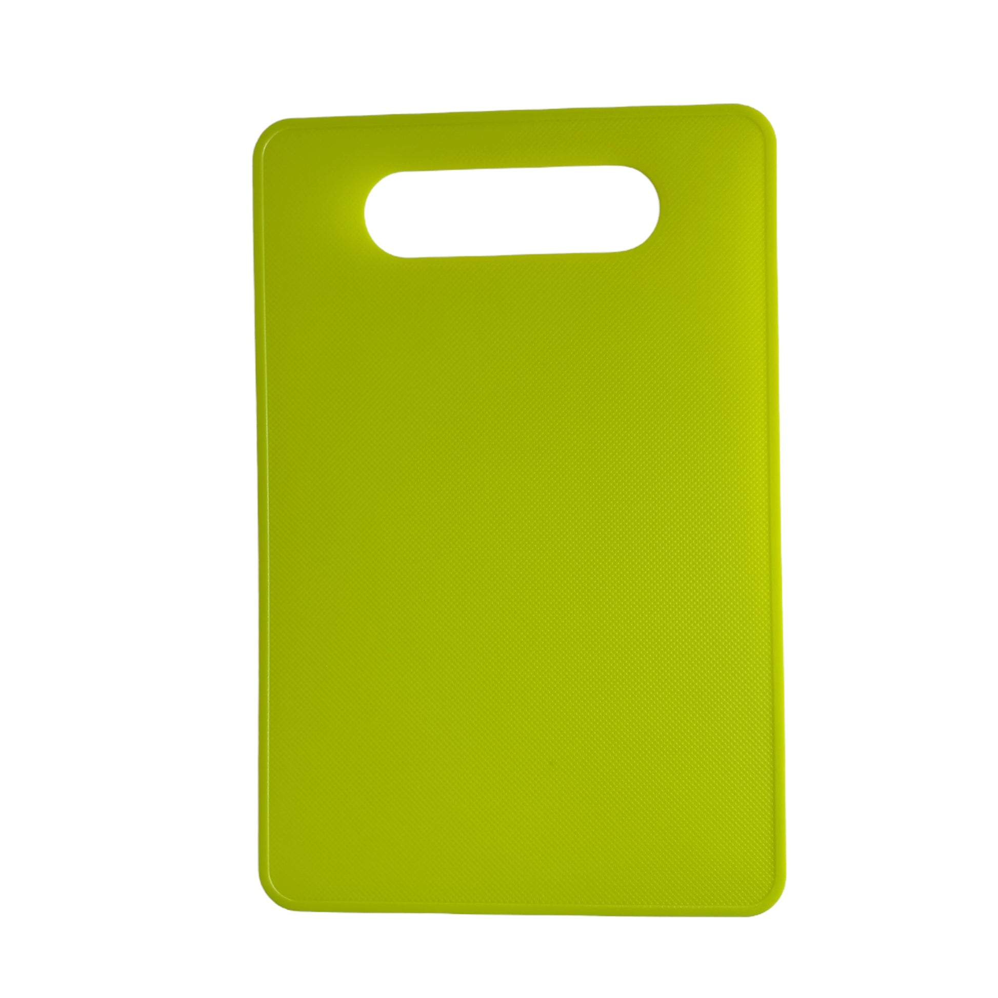 Image Description: The chopping board is rectangular with smooth, rounded corners and a cut-out handle at the top. It has a lightly textured surface. It available in a range of bright, high-contrast colours. The images show the board both individually and in a splayed arrangement alongside other colour options. Note: Some colours shown may also be shown that are not currently be available on Kylee & Co. The full colour in images spread include yellow, purple, pink, blue, mint green, light green, grey, black, beige, & teal.