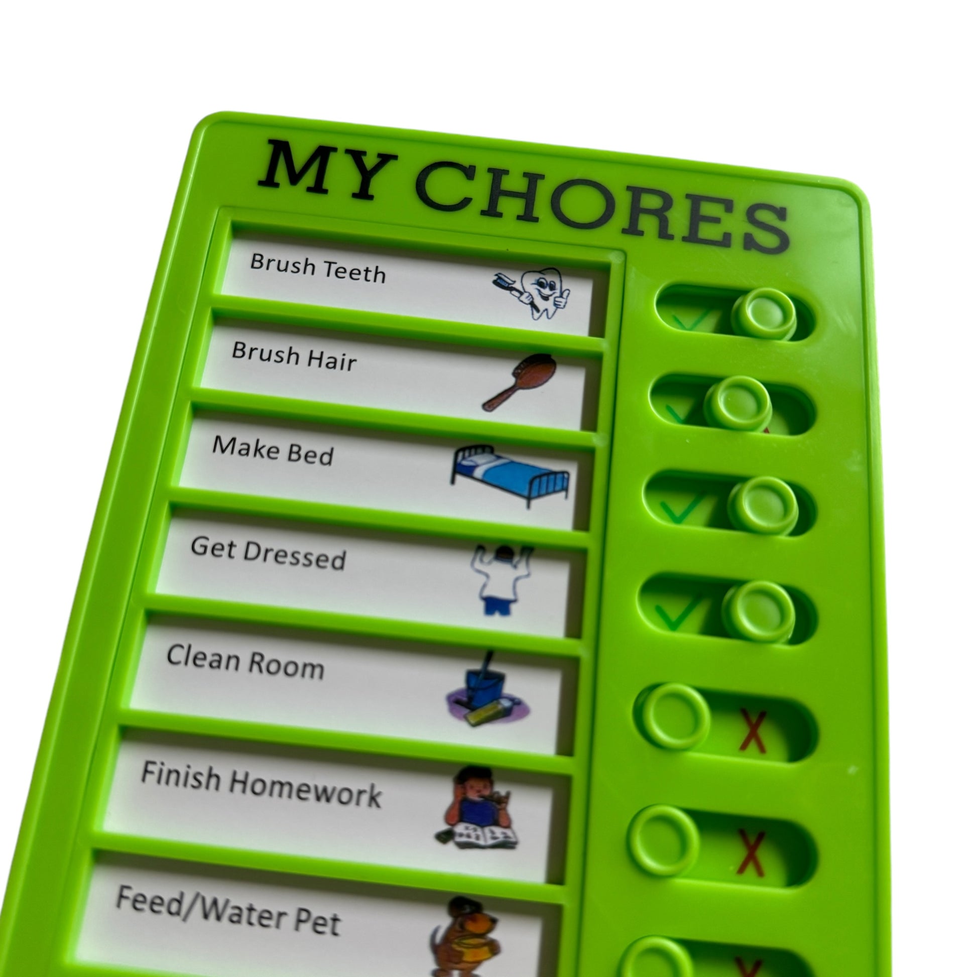 The chore board is printed on biodegradable plastic that is suitable for pets and humans. The unique design of the slider means that it is easy to slide back and forward, but will stay in place once it is moved. The list is easy to access and change, as the front plate can easily snap off to change the insert inside.