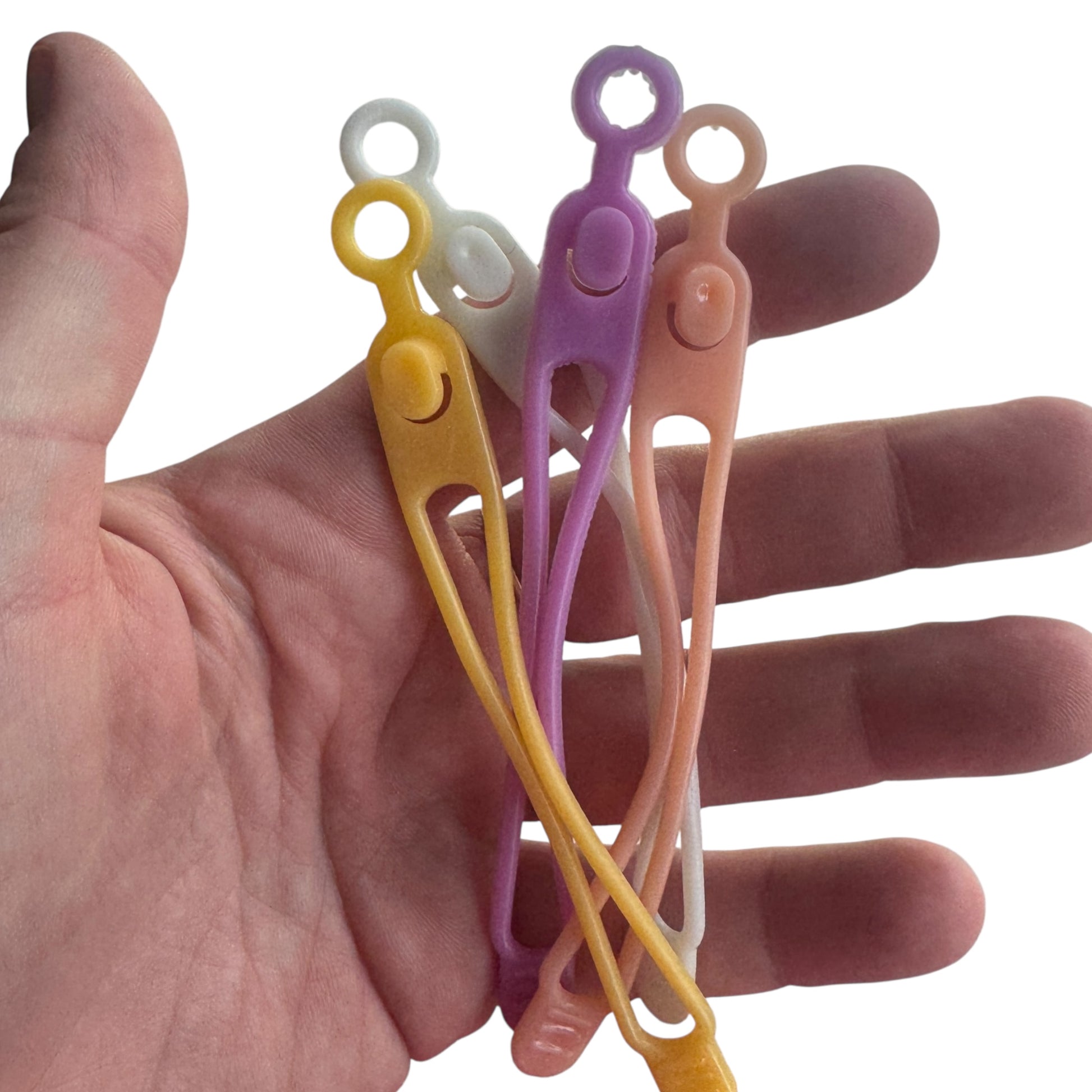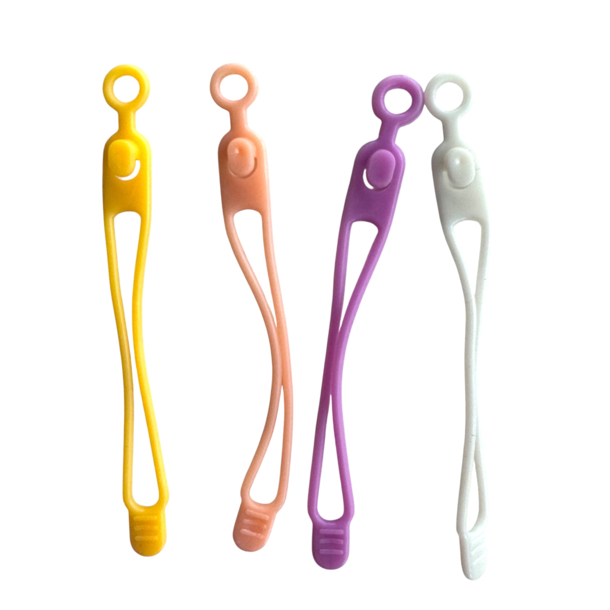 Image Description: Silicone cable ties in yellow, pink, white, and purple, each with a button loop design for fastening. Laid out on a white background, showing their soft, flexible build for organising cords or tubing.