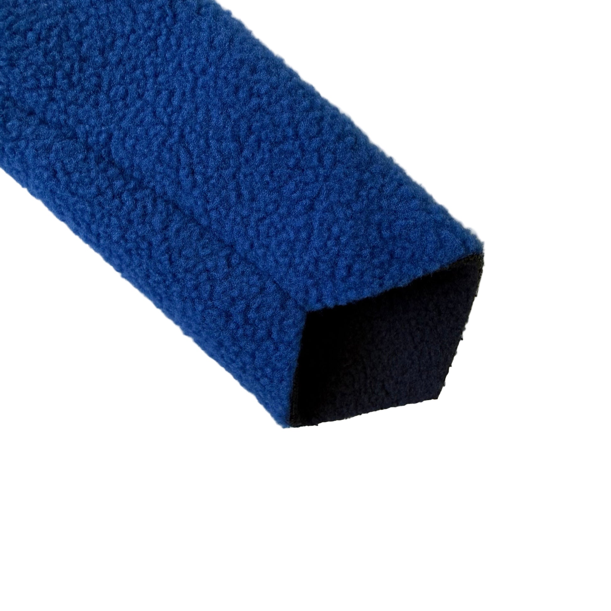 Image description: Two soft, fleece CPAP strap covers in a bright royal blue colour. Each cover has a Y-shaped design with darker inner fabric at the ends where the straps slide through. The covers are shown both on their own and attached to the cheek straps of a nasal CPAP mask headgear on a mannequin head, demonstrating how they wrap around the straps to provide cushioning and skin protection.