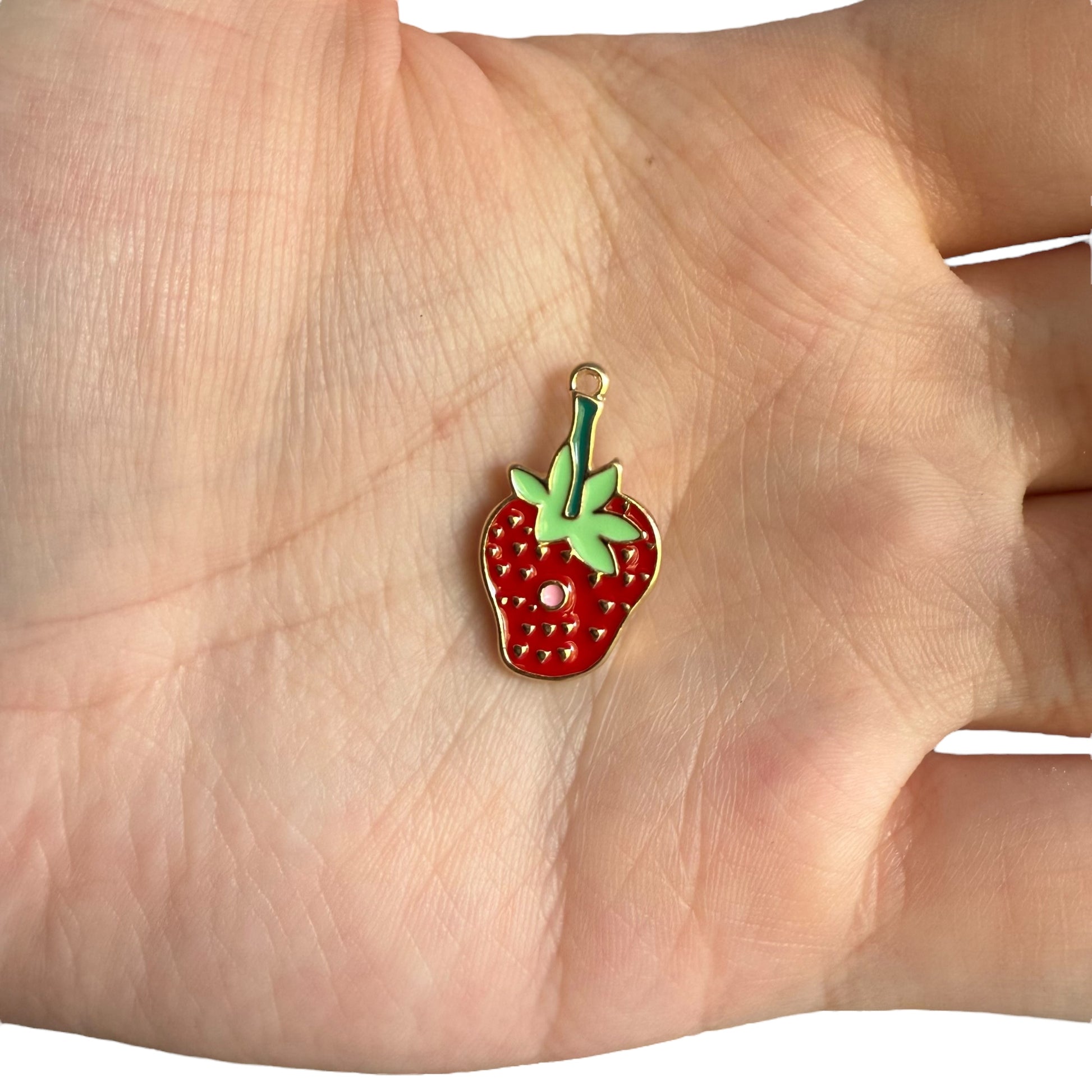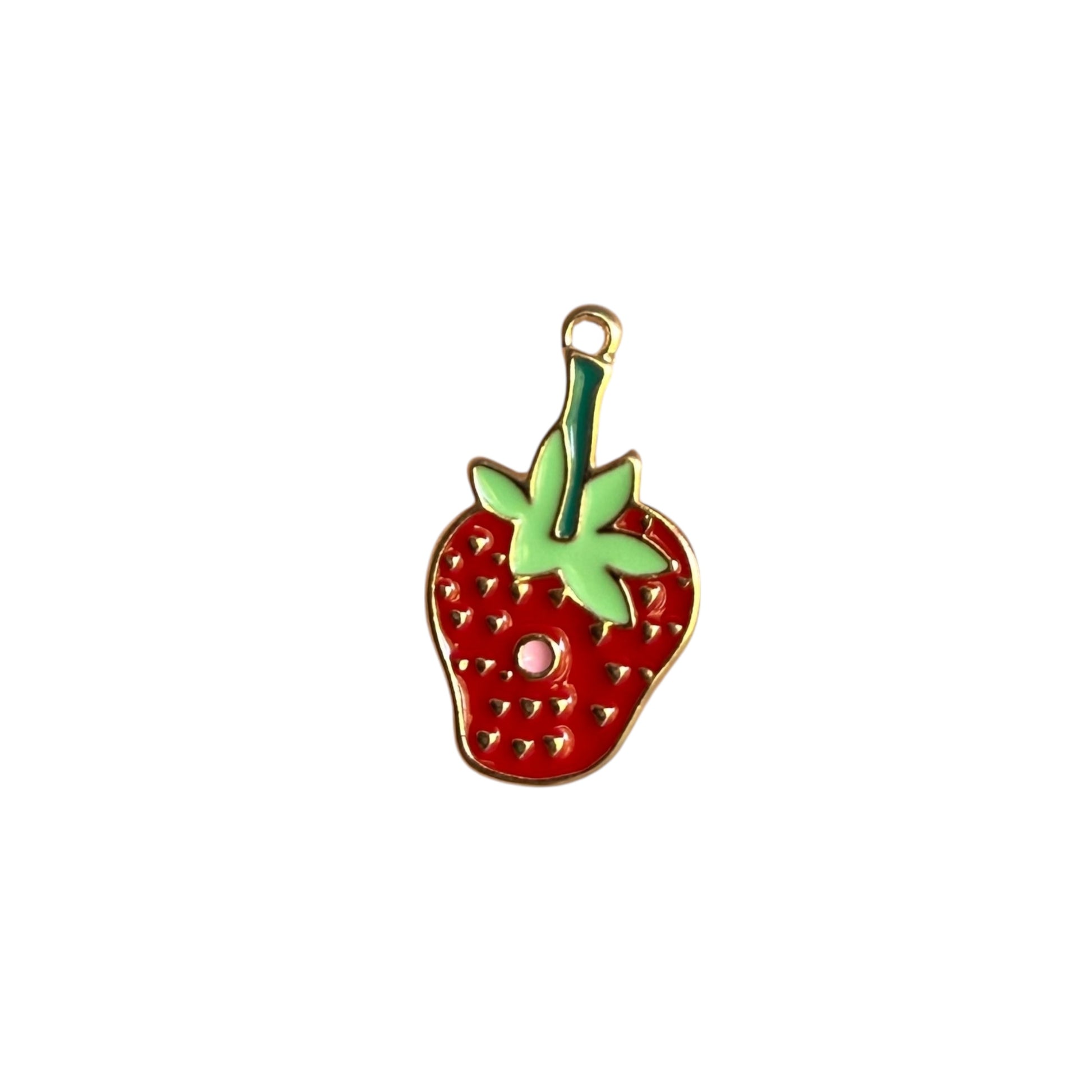 Image Description: Two colourful enamel charms. One is a cheerful, stripy green caterpillar with a bright red face, and the other is a vibrant red strawberry with green leaves and tiny seed details. Both have little gold loops for attaching to jewellery, keychains, or crafts.