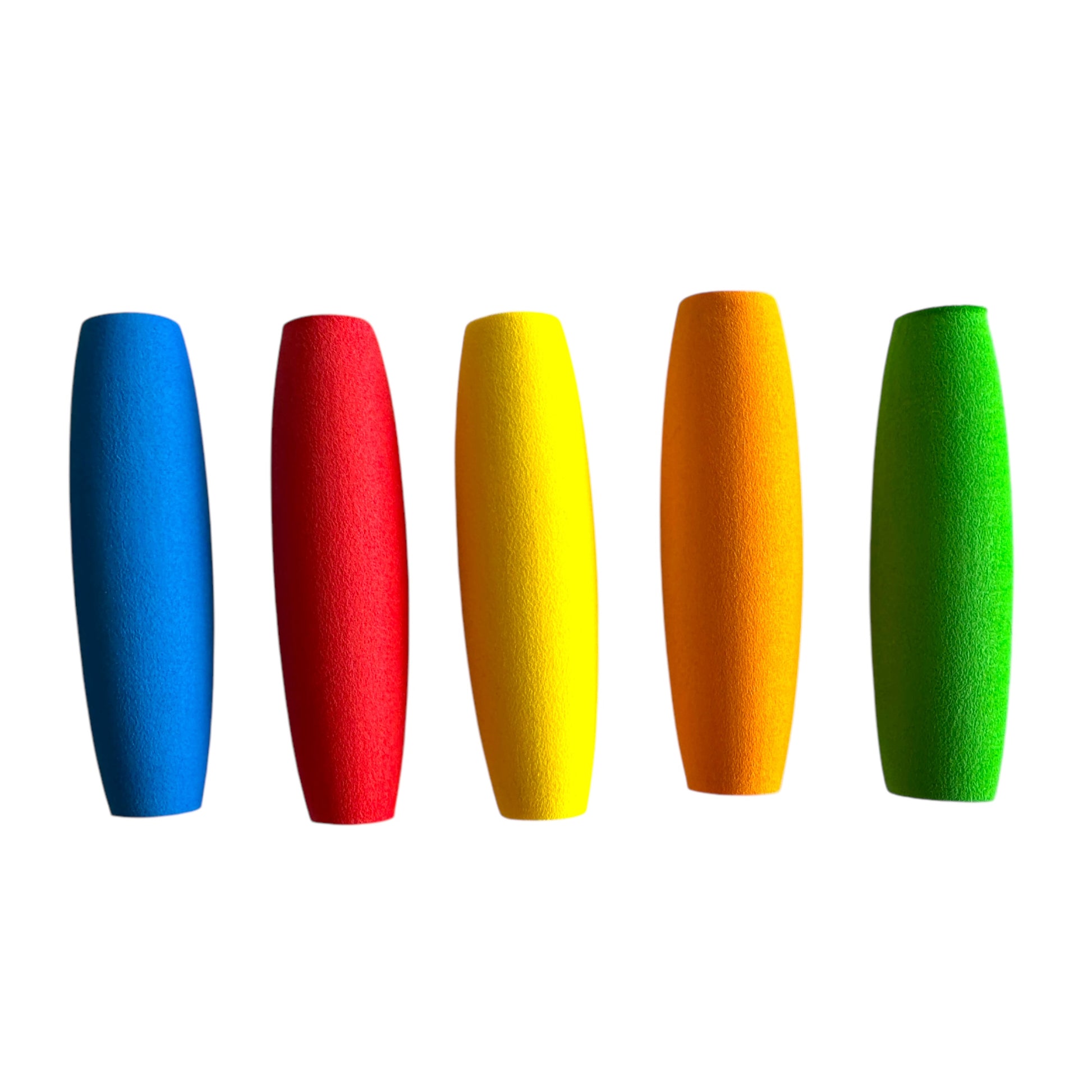 Image Description: Five colourful foam grips are shown in green, orange, yellow, red, and blue. Each shaped like a smooth, slightly textured cylinder with a hole through the centre. Photos also show the grips with a crochet hook and how they help hold the hook.