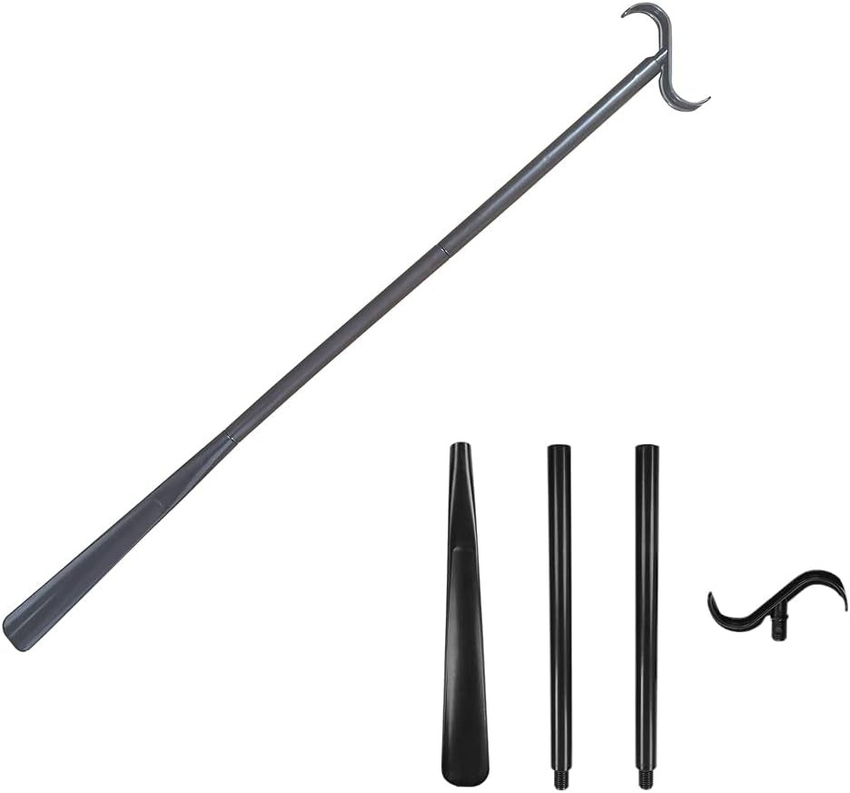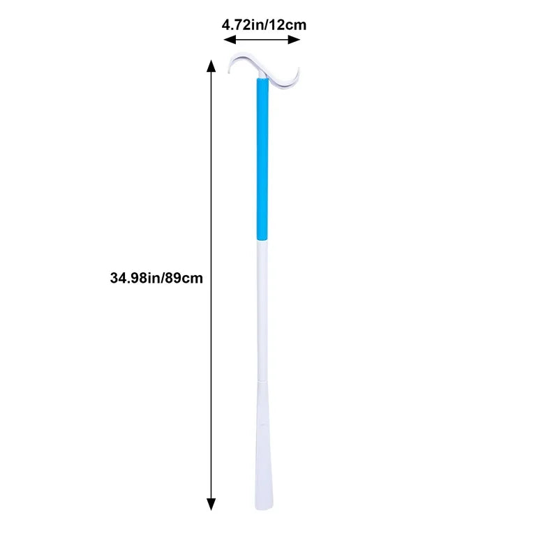 ➡️ Dressing Aid, opposite end features alternating dressings hooks. These hooks make it easier to put on clothes such as your socks, shoes, pants, shirts, jumpers, and jackets — both putting on and removing.