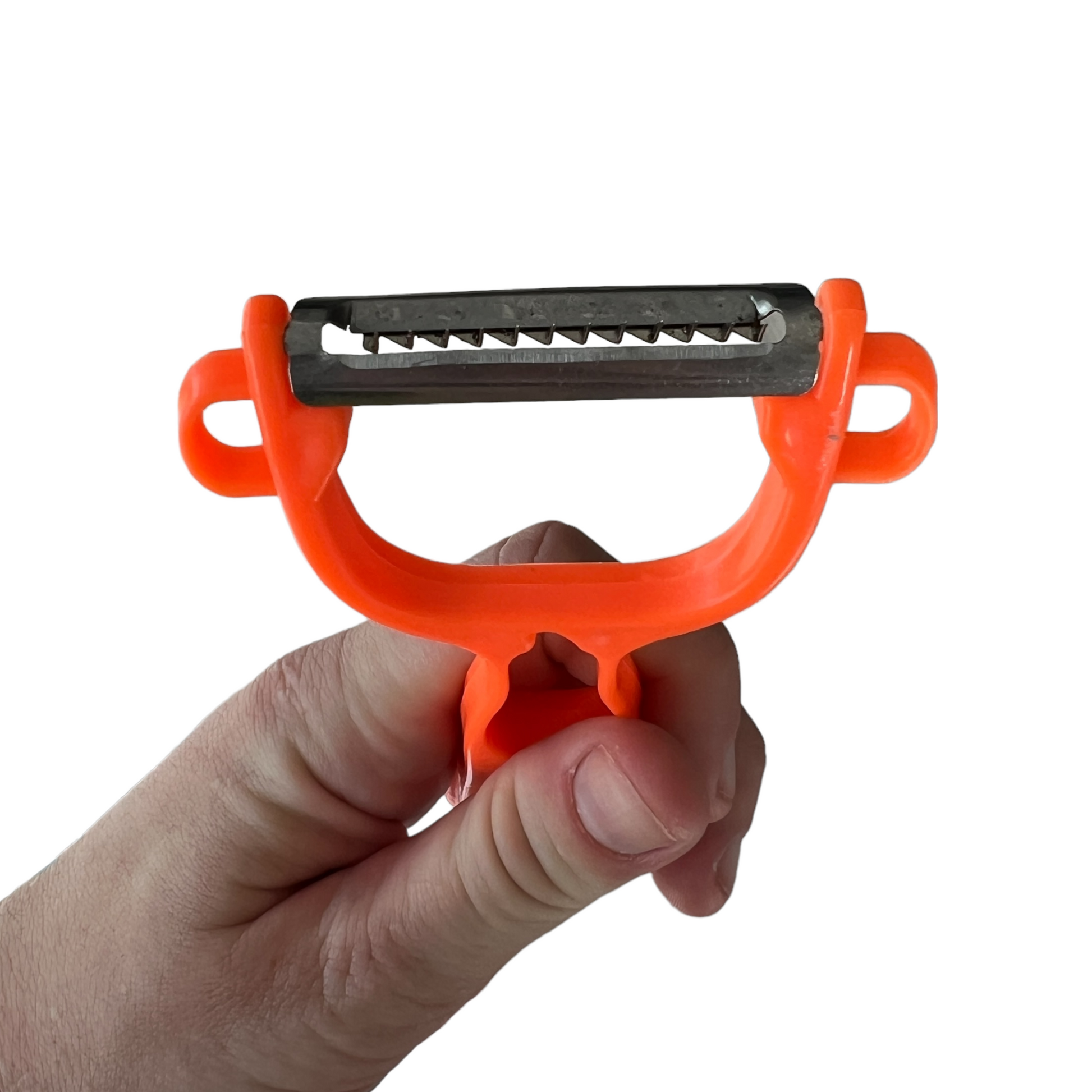 This peeler is an open hand design, allowing you to use your hold and grip the peeler without needing a lot of grip strength. It can be used to help protect the fingers from any accidental nicks or injuries, and has two peeling options — peel, or shred! It can also grate, and remove the “eye” from vegetables easily too. It has blades made with a sharp stainless steel that will not easily blunt or rust with proper use. It can be washed and dried or is also very dishwasher safe.