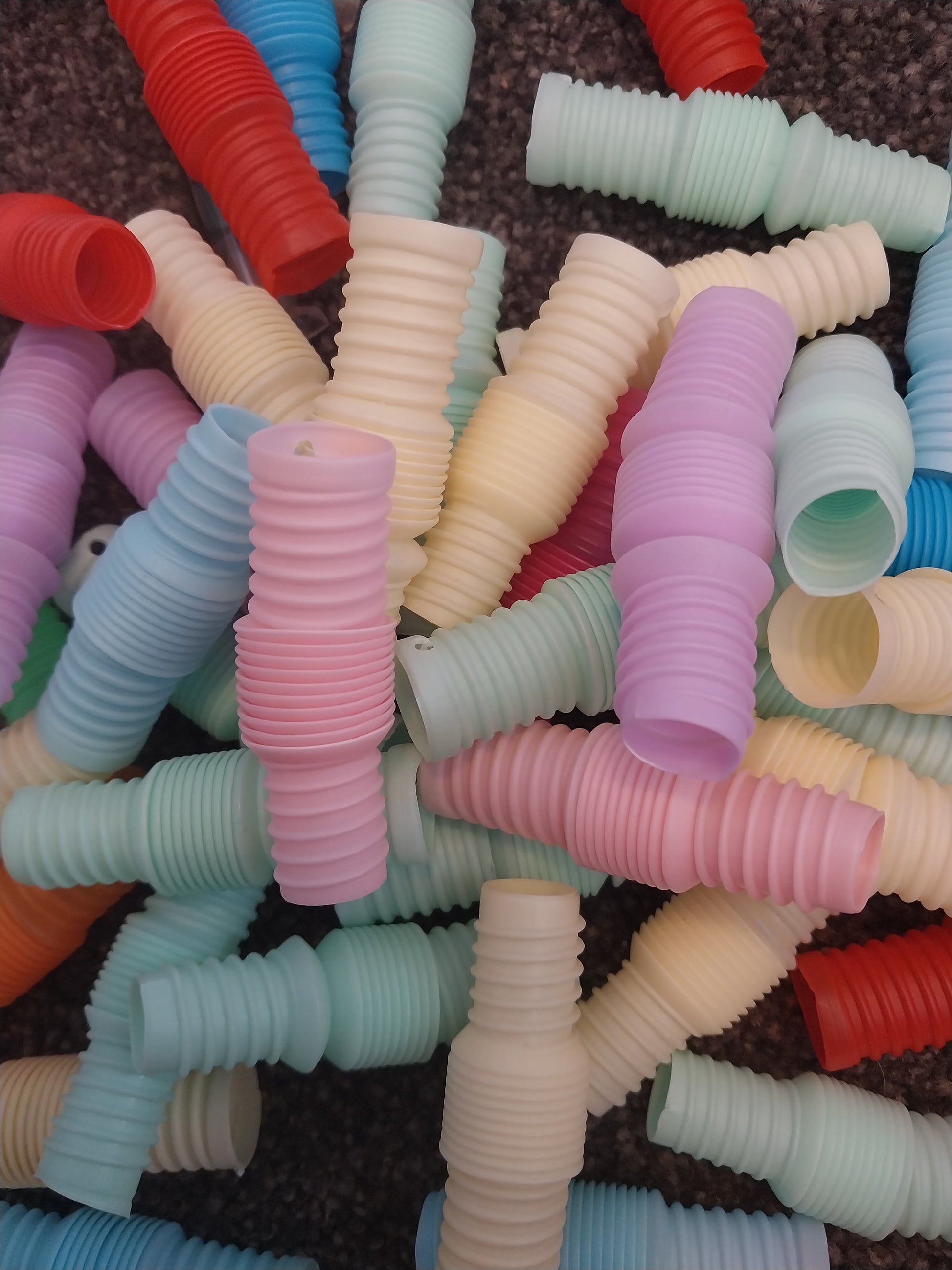 Versatile and colorful, these pop tubes twist together to create vibrant chains and various shapes depending on how far you pop, twist and move them. Enjoy the dual sensory experience of vibration and sound, complimented by a range of bright and pastel colours for adding visual delight. These make a great and fun sensory fidget tube for kids and adults alike!
