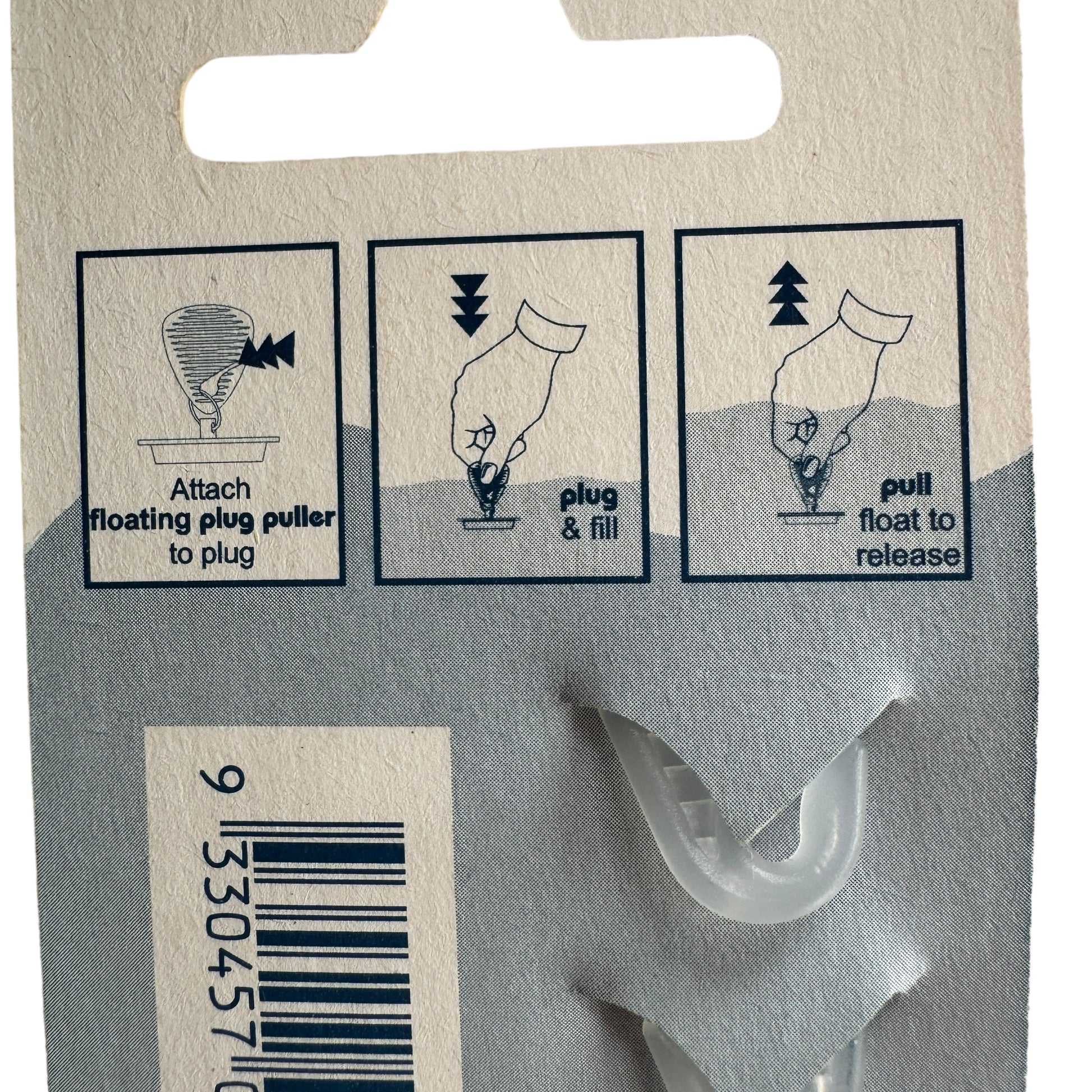 Image Description: A small plastic tag with a loop at the bottom to hold onto the plug itself. The tab floats to make it easy to grab and pull the plug more easily. Each card sold has 3 plug pullers for your use/needs.