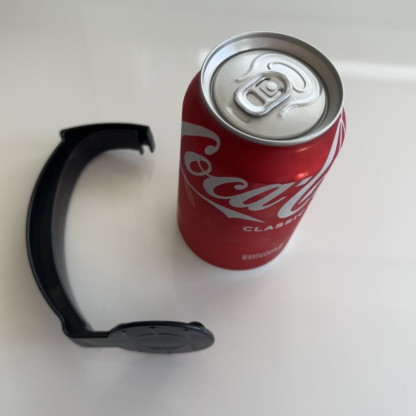 Image Description: Black plastic handle that snaps into place on a can of fizzy drink making it easier to hold. Photos show the item, as well as it being connected to a can of fizzy drink. It is reusable.