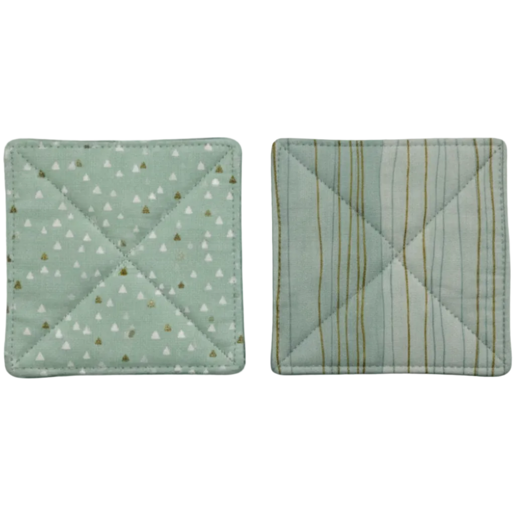 Image Description: A set of handmade quilted coasters featuring a mix of soft greens and patterned fabrics. The front side shows patchwork-style squares in complementary prints, and the reverse side is a textured green fabric with stitched quilting lines forming a cross pattern. Coasters are soft, neatly stitched and square in shape.