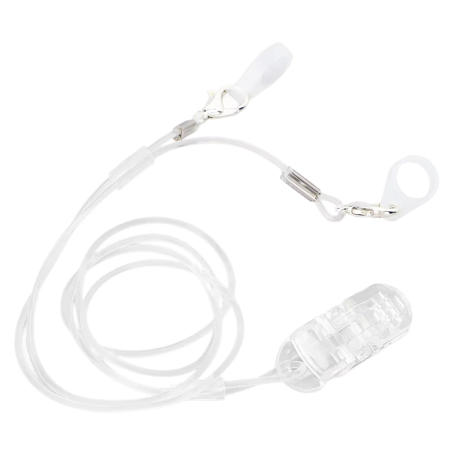 This set is for the clear clip with the transparent and clear nylon elastic. This is a great option for people who would like the security of knowing their hearing aids are safely secured to them, and want a discrete option, while still assurance and extra peace of mind.