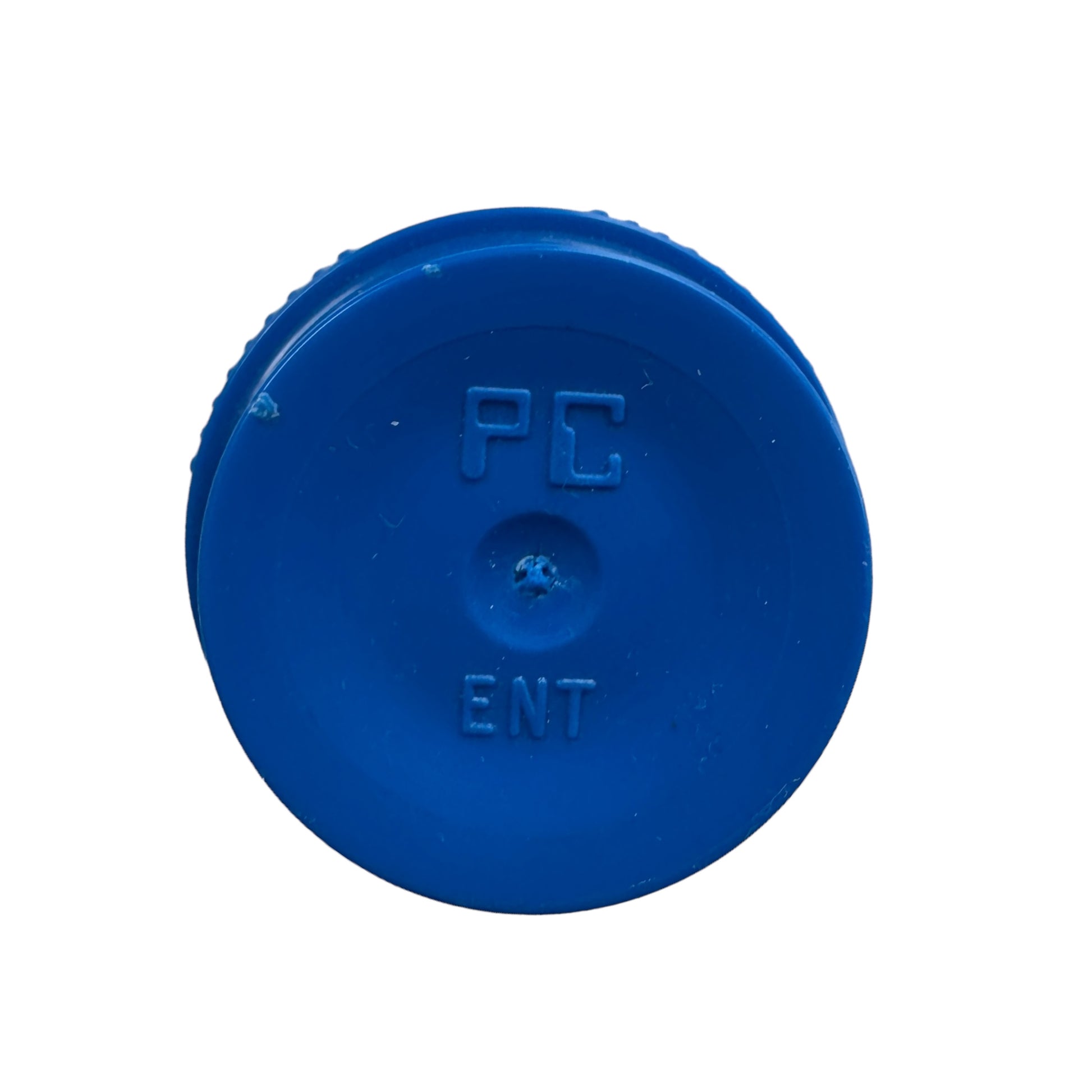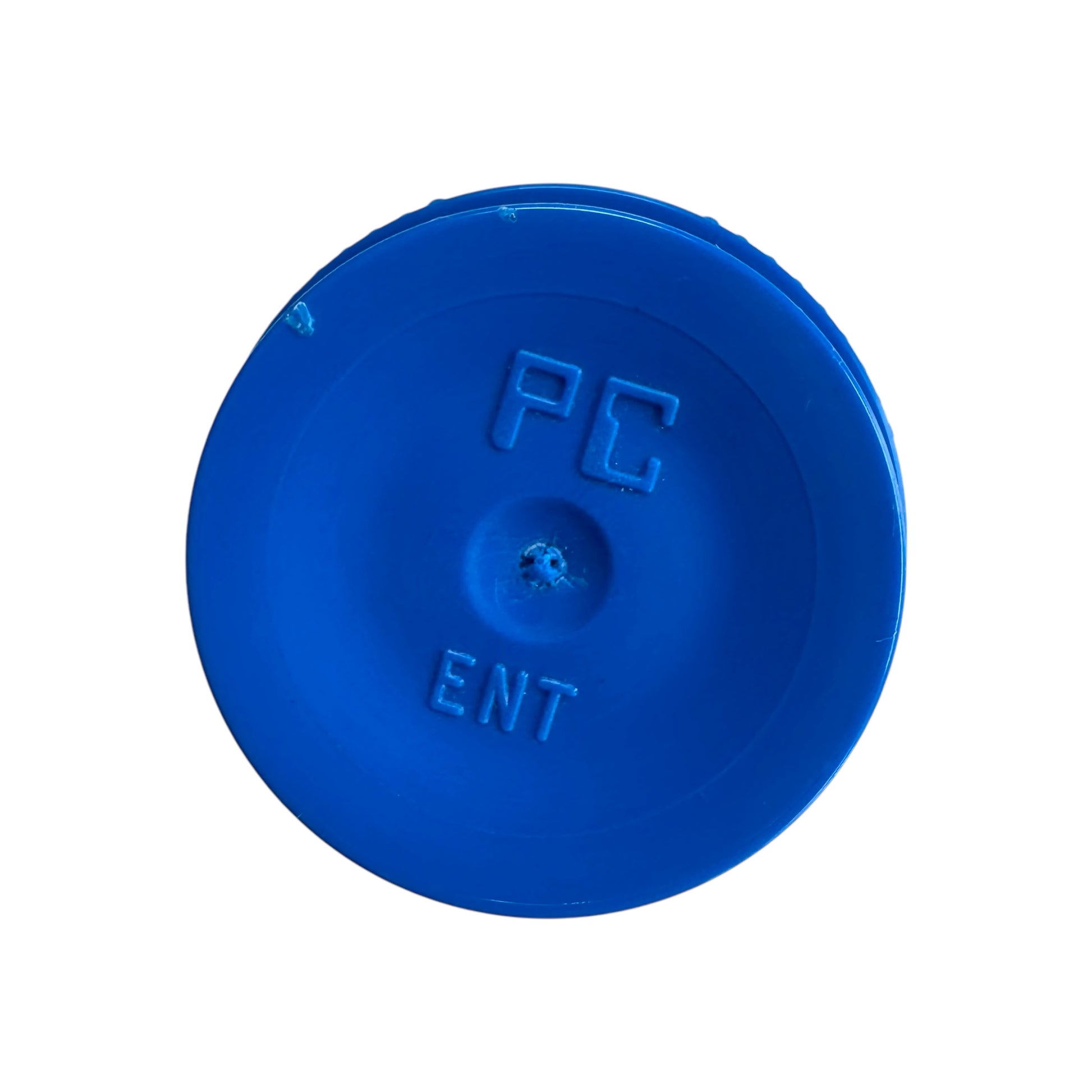 Image Description: A blue plastic bottle seal opener. It fits over the milk bottle, with a small spike that enters the milk bottle, and cuts the foil easily for uou. You place the cap on the milk bottle and then twist the cap 90 degrees and turn it, for it to break the seal.