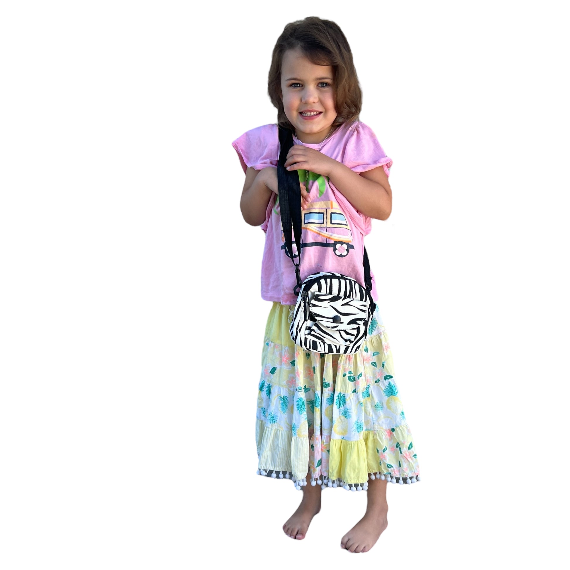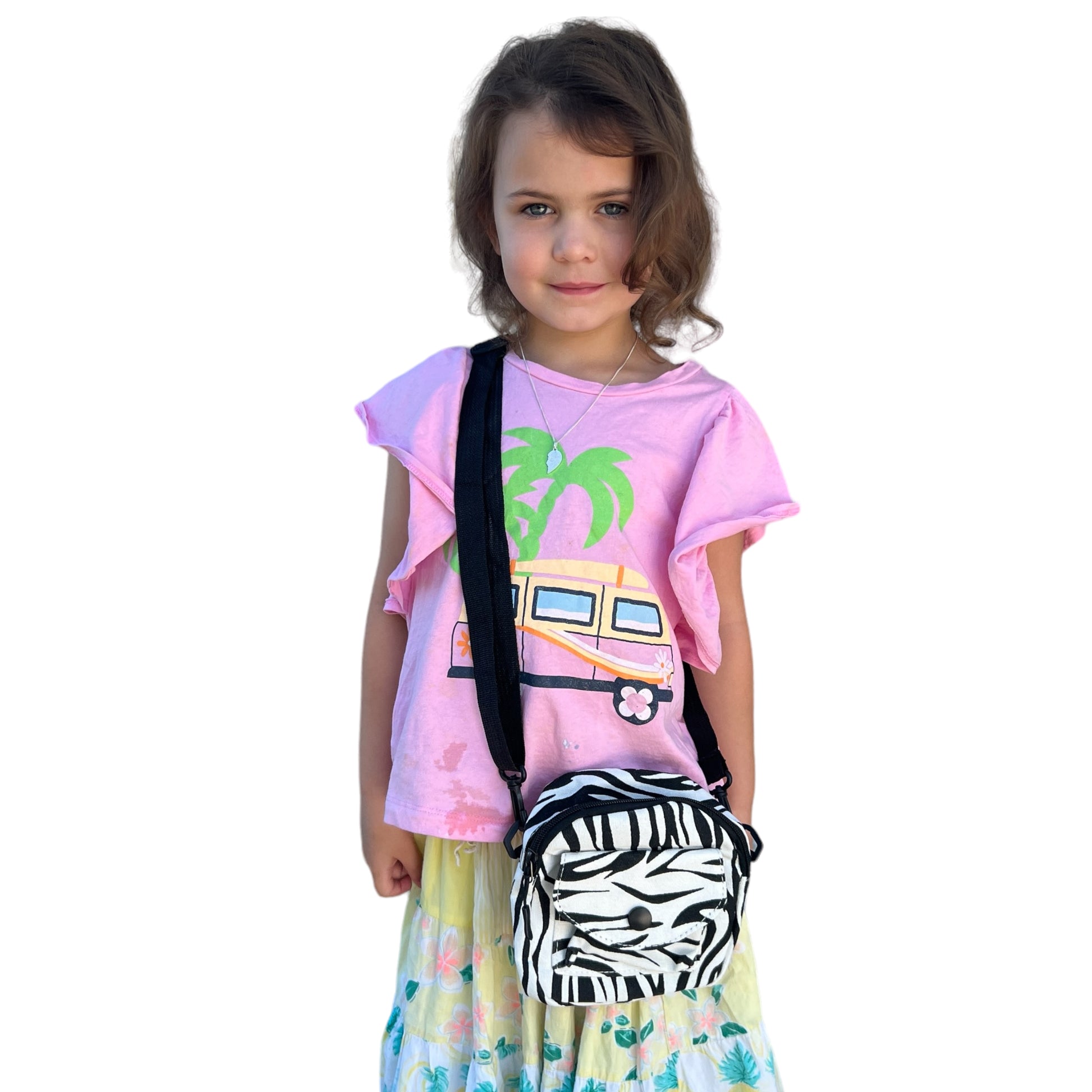 A super cute and stylish small zebra crossbody bag with an easy light eight zip in the main compartment, as well as an additional front pocket that seals closed with a snap. It has a loop to make your bag easy to hang up as needed and offer you a grip handle to hold, and a crossbody full length adjustable shoulder strap to make wearing the bag easy and comfortable.