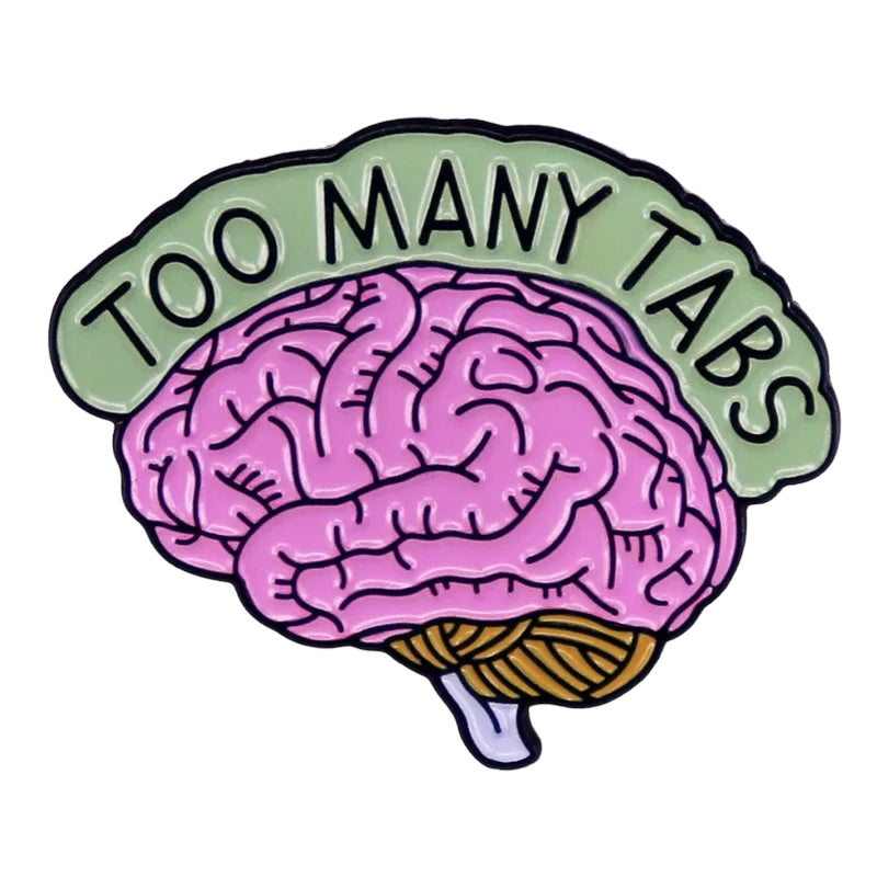 Showcase your busy, bustling mind with our "Too Many Tabs Open" pin. Featuring a quirky illustration of a brain and the humorous phrase "Too Many Tabs Open," this pin is perfect for those who juggle multiple thoughts and tasks daily. Add it to your jacket, bag, or pin collection for a fun and relatable statement piece. It's an ideal gift for students, professionals, or anyone who can relate to the feeling of mental overload.