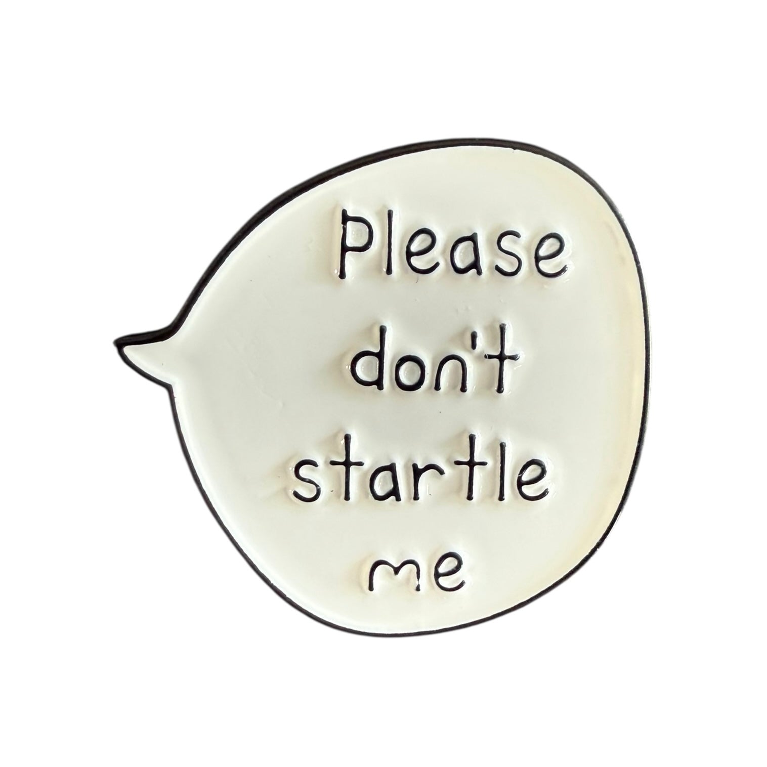 Image Description: A white enamel pin shaped like a rounded speech bubble. Inside, it reads “Please don’t startle me” in small black text with a hand-lettered style. The pin has a black outline and a glossy finish.