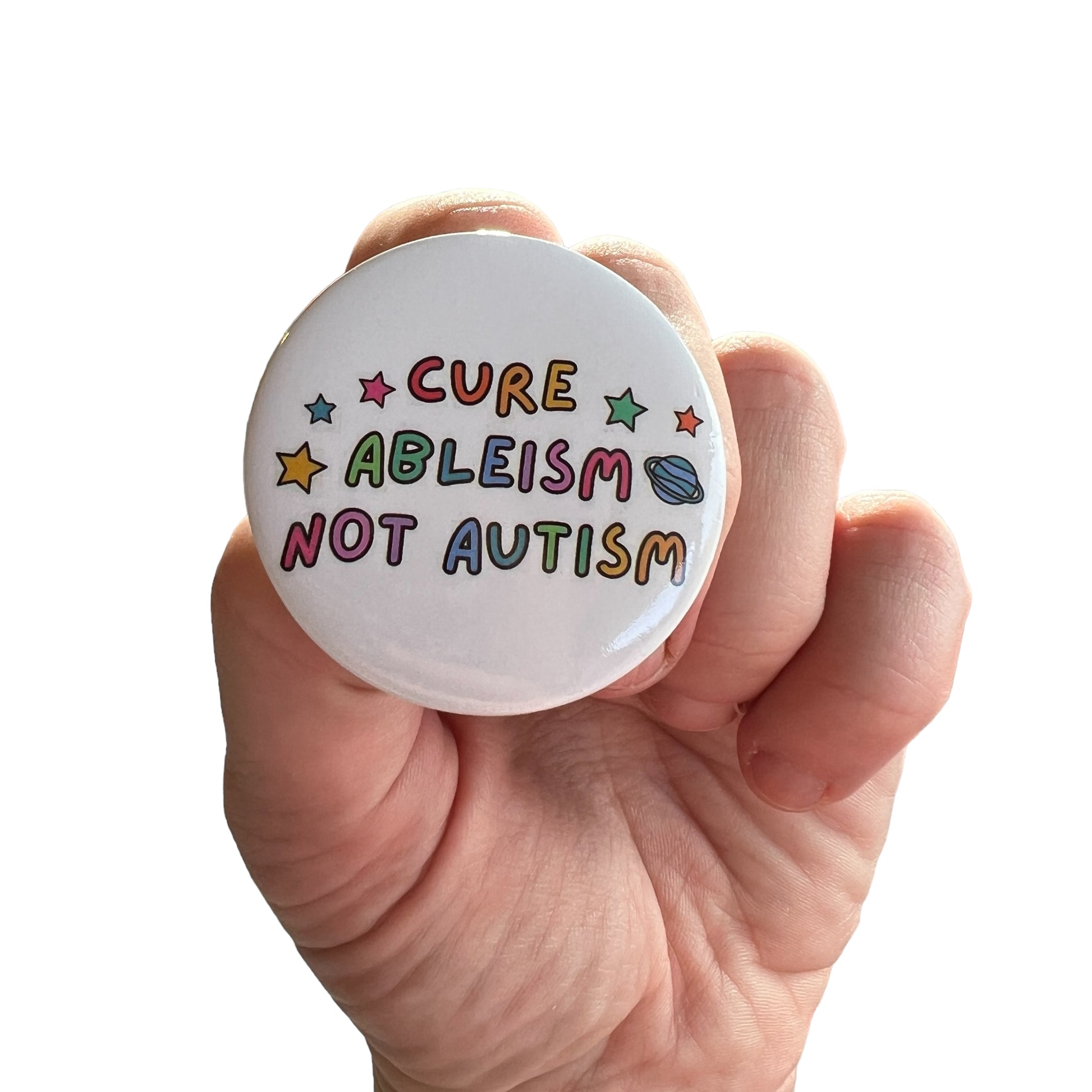 This pin says “Cure ableism not Autism”. On a white background the words are in many colours outlined in black. There are stars and a planet around the words.