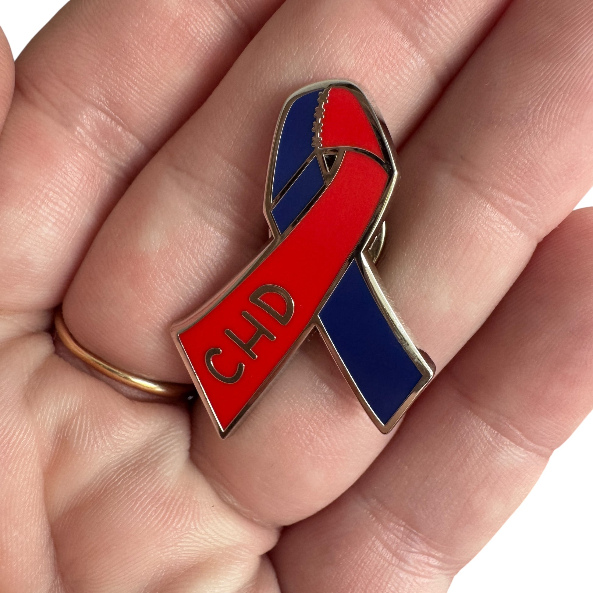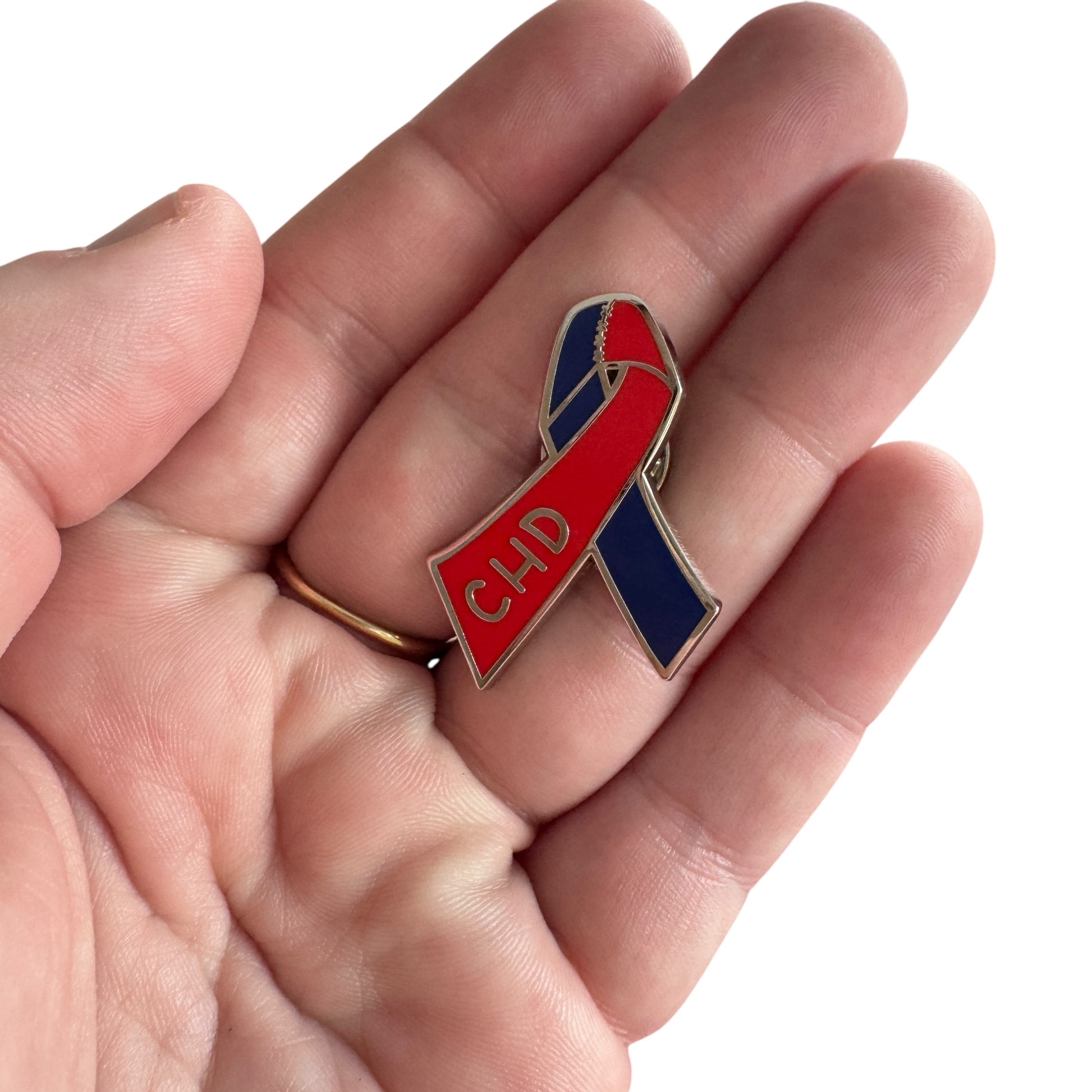 Image Description: A red and blue enamel awareness ribbon pin is held between two fingers. The ribbon features the letters “CHD” on the red side and a small stitched design where the two colours meet—symbolising heart surgery scars. The pin has a silver outline and butterfly clutch backing.