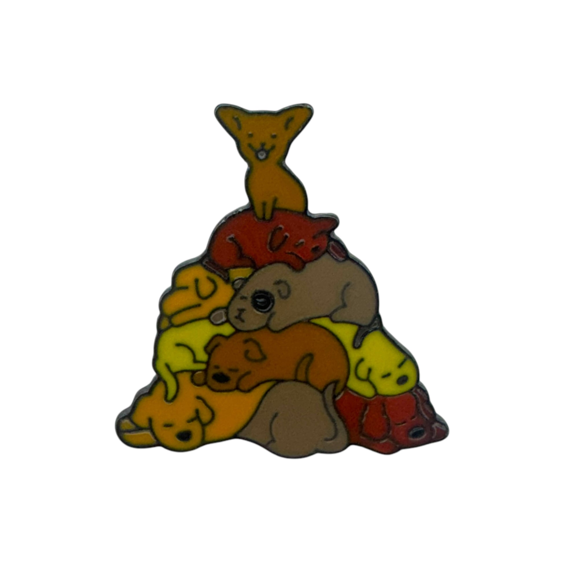 Image DescriptionA pin showing a colourful pile of sleeping cartoon puppies in yellow, orange, red, and tan shades. One small puppy sits proudly at the top of the pile. The pin has a playful, heartwarming design and is shown resting on a hand for scale.