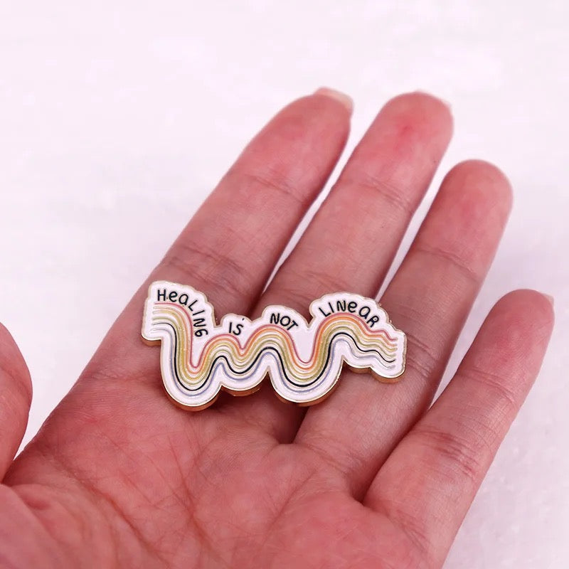 Image Description: A decorative enamel pin with multicoloured wavy lines forming a squiggly path. The text reads “Healing is not linear,” with each word placed along the curve. The pin is outlined in gold and filled with red, yellow, green, blue, and black lines.