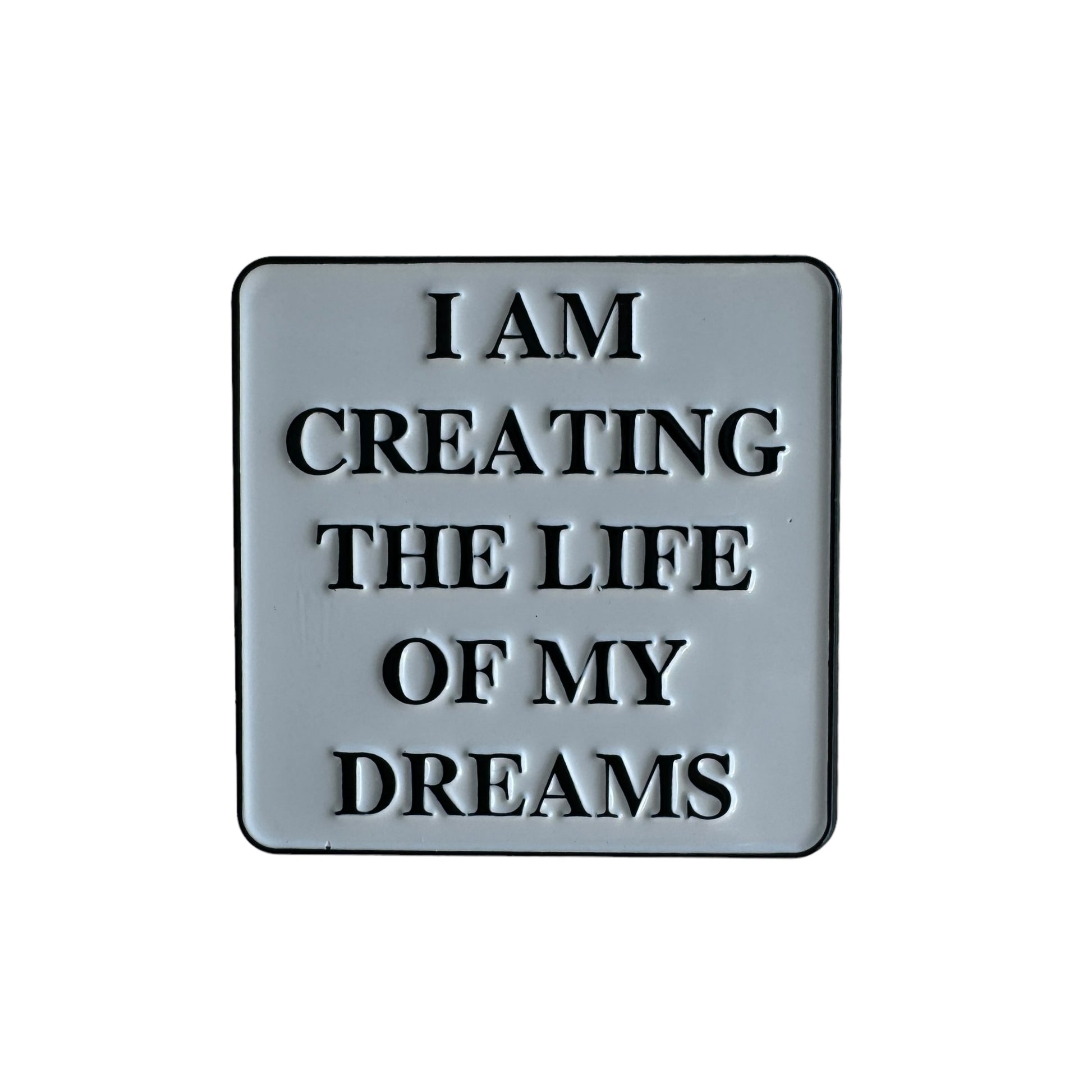 Image Description: A square metal white pin with black outline and the words written in block letters “I am creating the life of my dreams”.