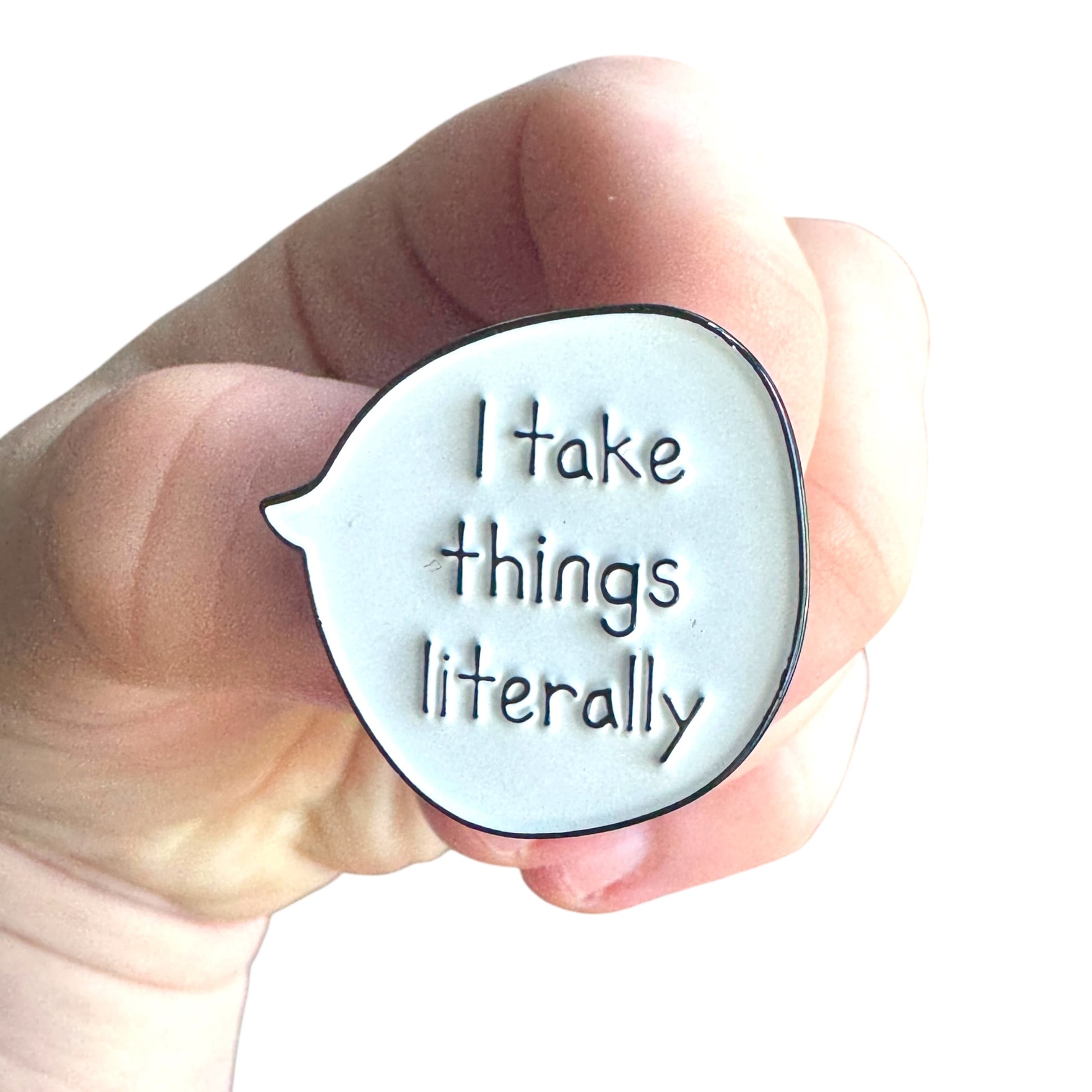Image Description: A hand holds a pin shaped like a speech bubble with the raised text: “I take things literally.” The background is white, and the text is embossed in black for visibility.