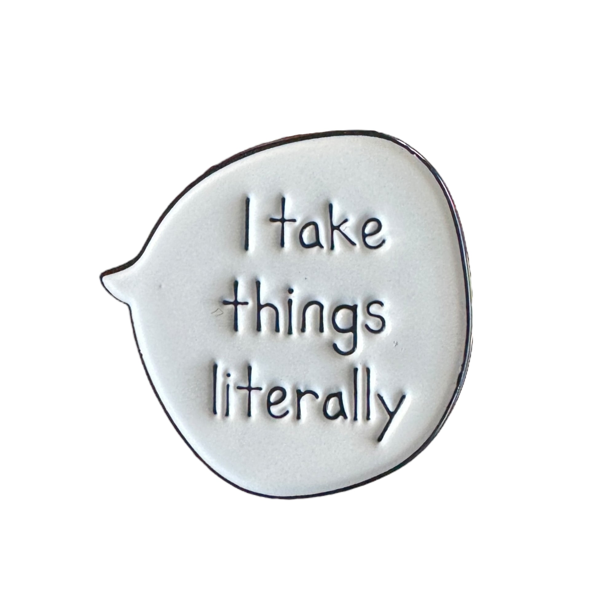 Whether it’s neurodivergence, communication differences, or just your honest nature, this pin makes it clear (literally). Designed in the shape of a speech bubble with raised text that reads “I take things literally,” it’s a light-hearted but meaningful way to express how you experience the world.