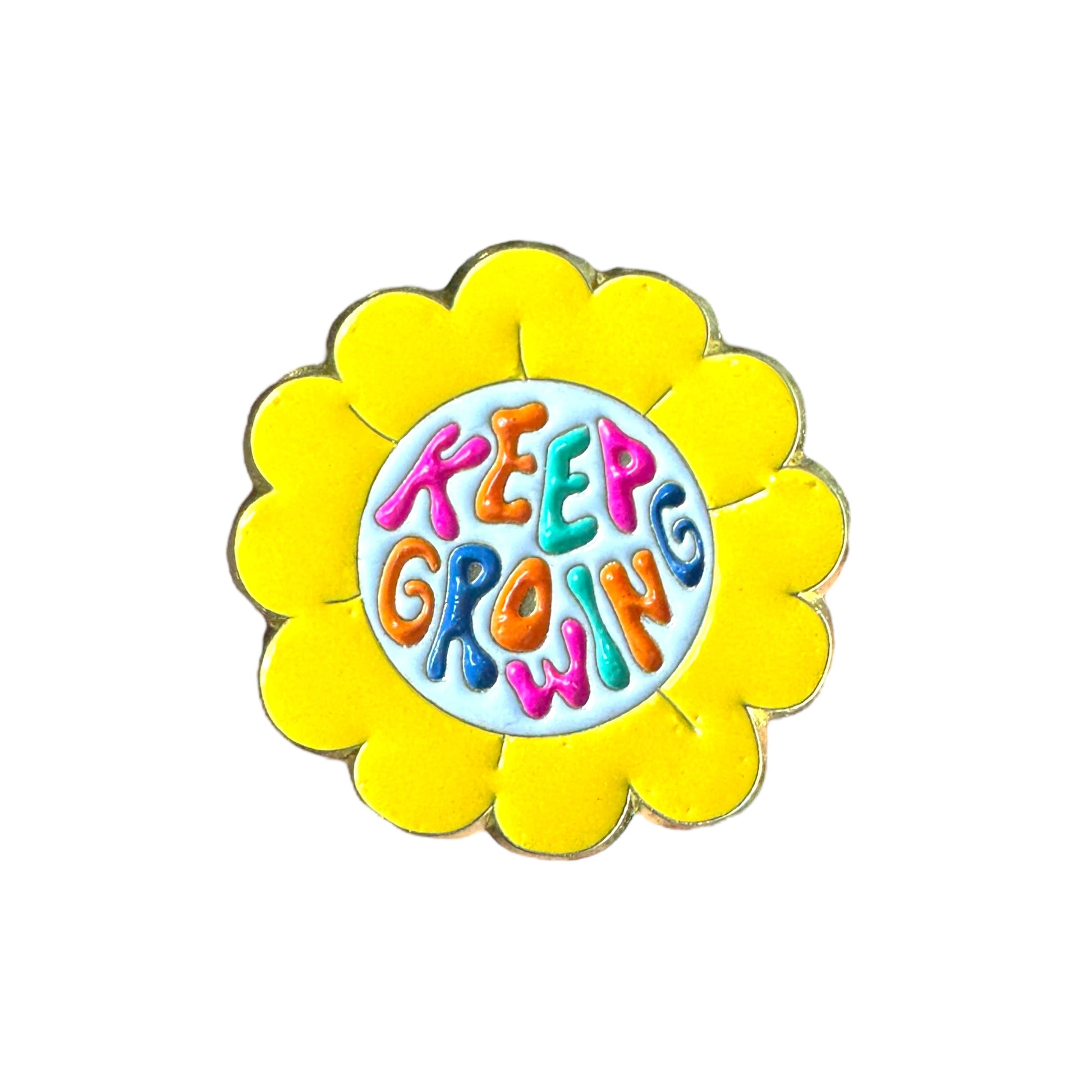 Image Description: A round enamel pin shaped like a yellow flower. In the centre, colourful bubble-style letters spell out “KEEP GROWING” against a white background.