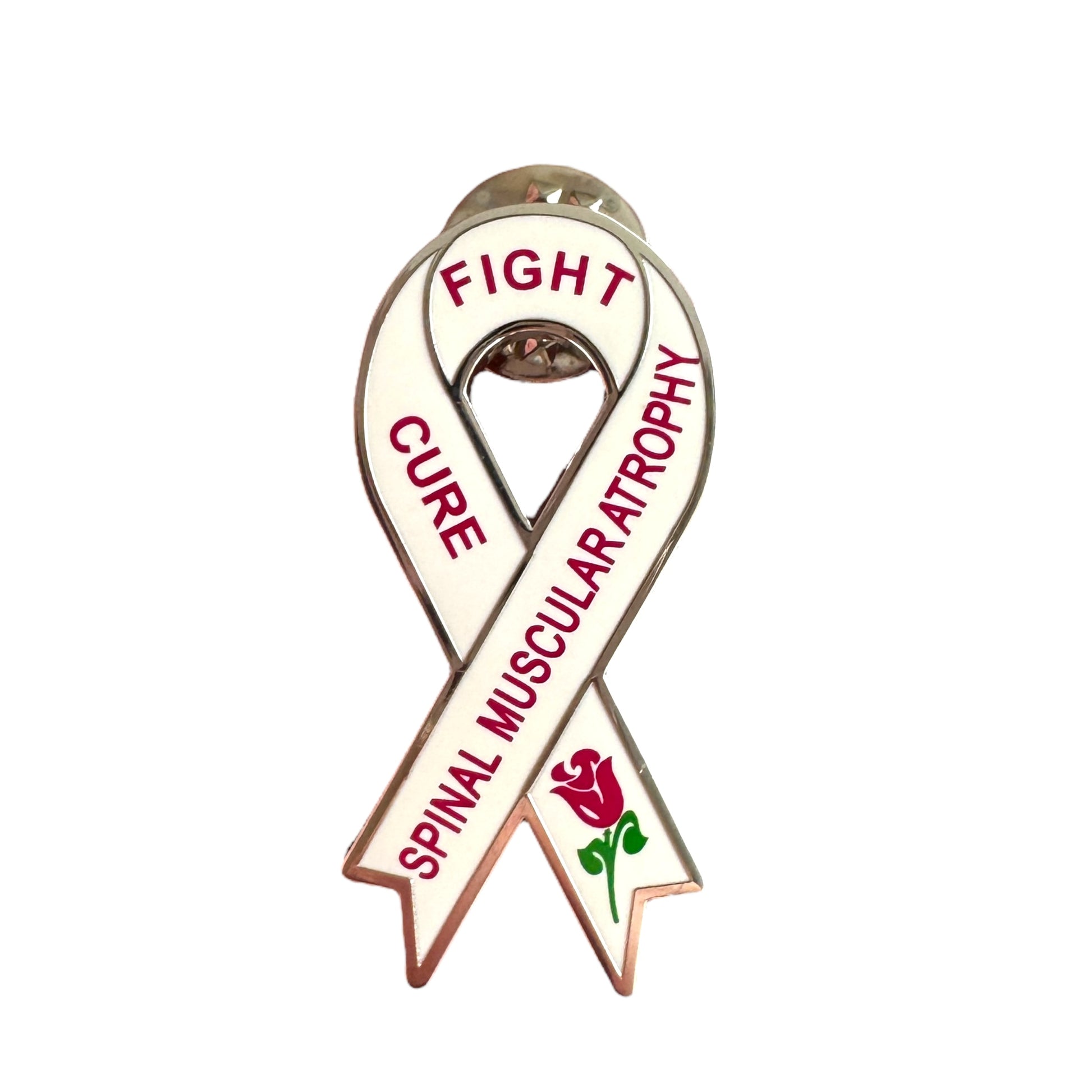 Image Description: A white awareness ribbon pin is held in an open palm. It features red text that reads “FIGHT,” “CURE,” and “SPINAL MUSCULAR ATROPHY” along the ribbon, with a red and green rose at the bottom. The silver edges and butterfly clutch backing give it a polished finish, while the message speaks volumes without needing a word spoken.
