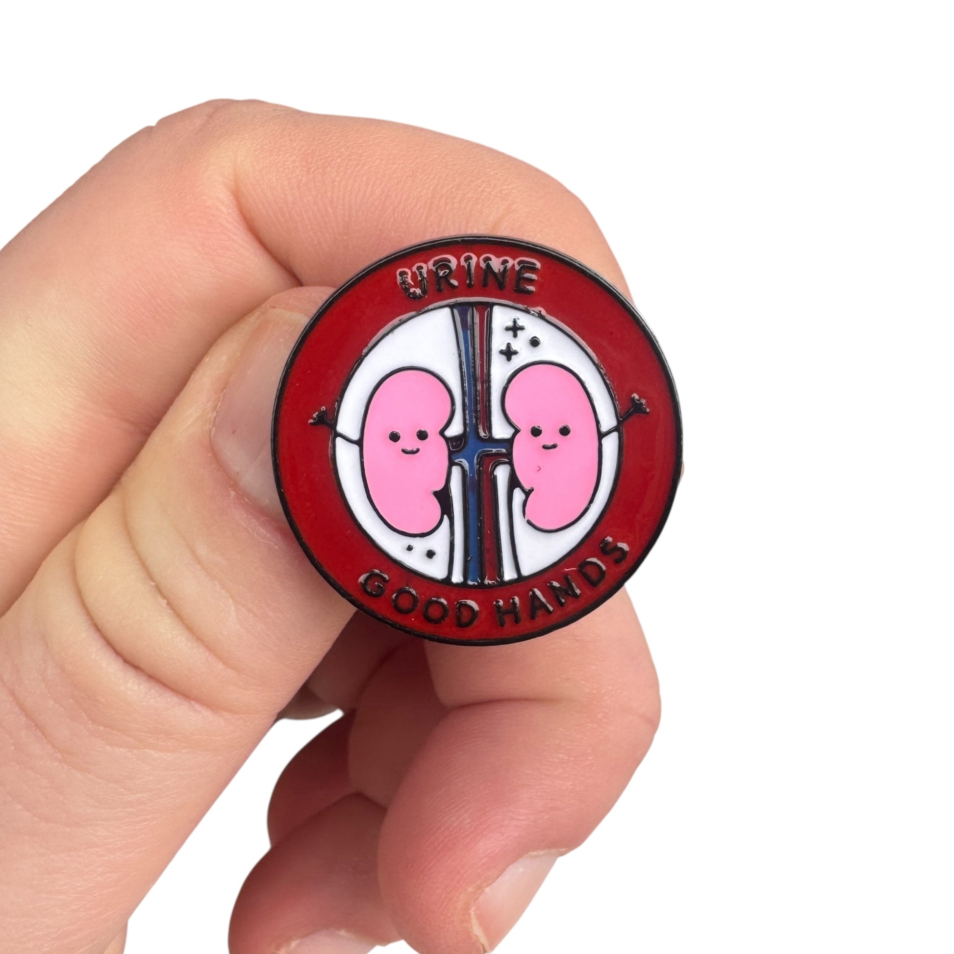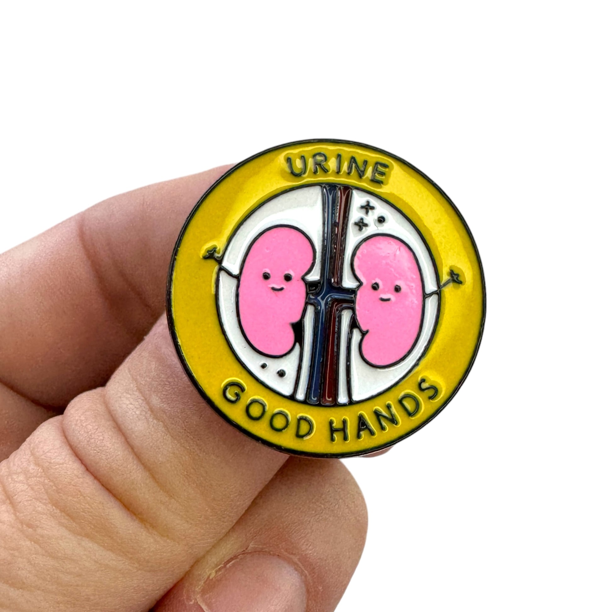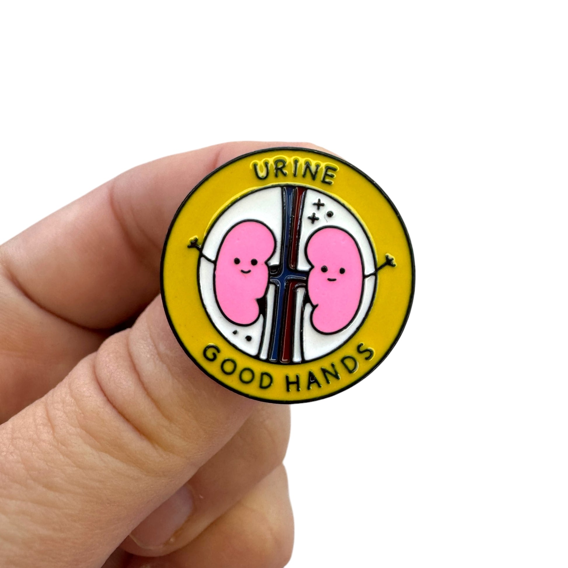 Image Description: A round enamel pin with a yellow border featuring the words “URINE GOOD HANDS.” In the centre are two smiling cartoon kidneys holding hands over a stylised renal system background.