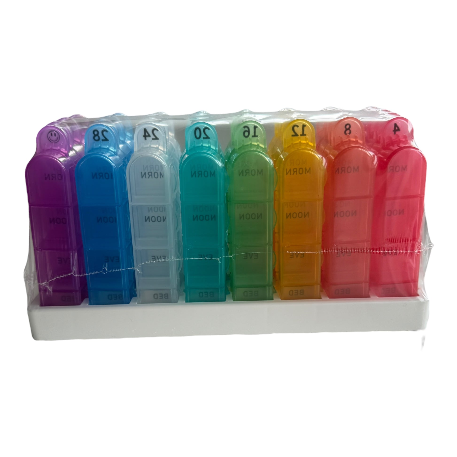 Package includes: 28x compartment meds container for 4x doses per day + 1x storage / holding tray.