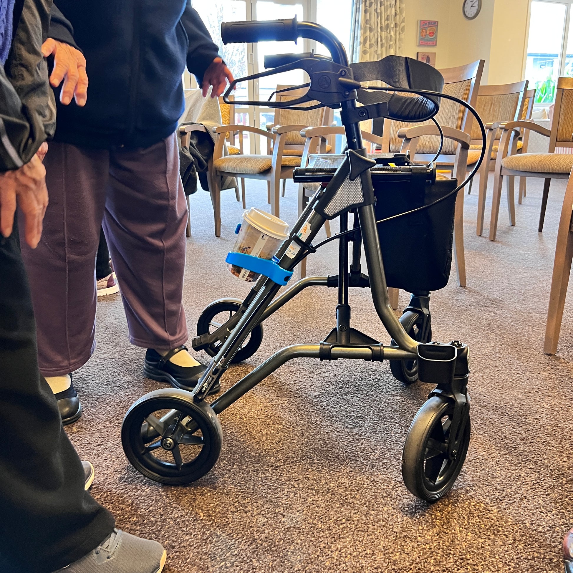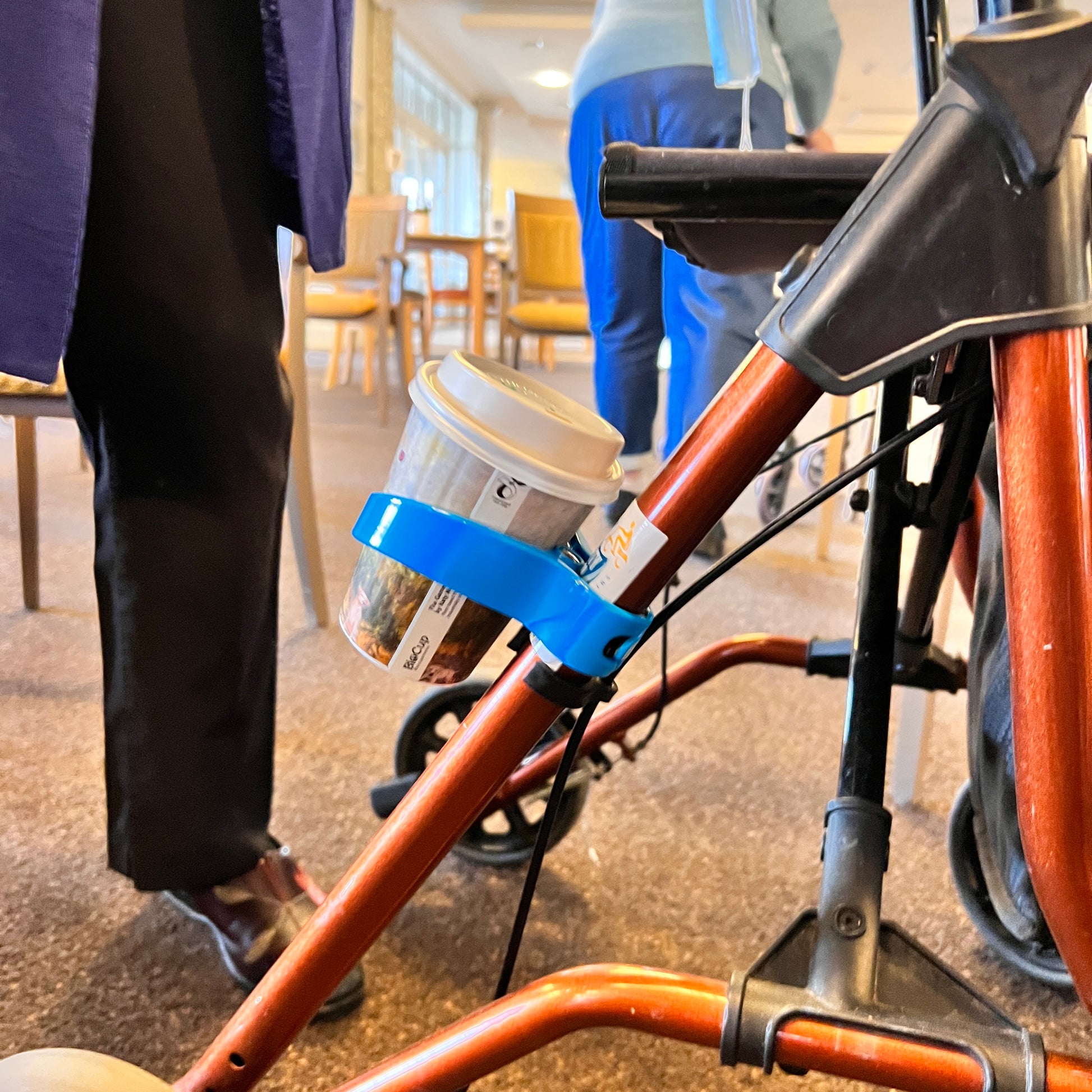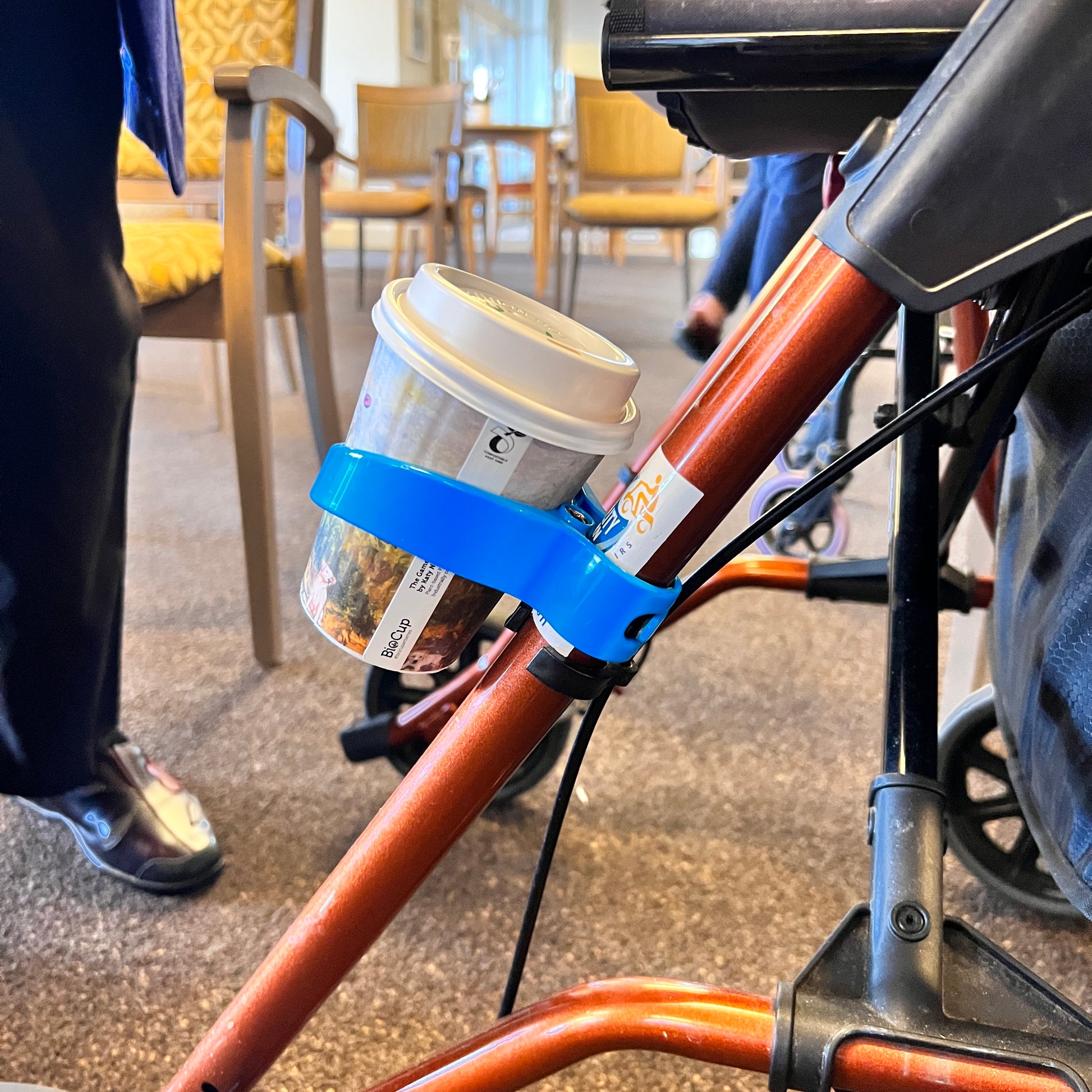 These cup holders can also be used for a range of other modes of transport also — for example: bikes, scooters, prams and push chairs — even mobility devices, such as wheelchairs, crutches, walking frames, scooters and even a good ol’ IV pole! If your pole is a wee bit smaller than this size, than we have some special inserts you can use (just enquire with us), or we have also seen electrical tape used to help create a surface to have an easily removable holder attach and detach quickly and easily as is needed!