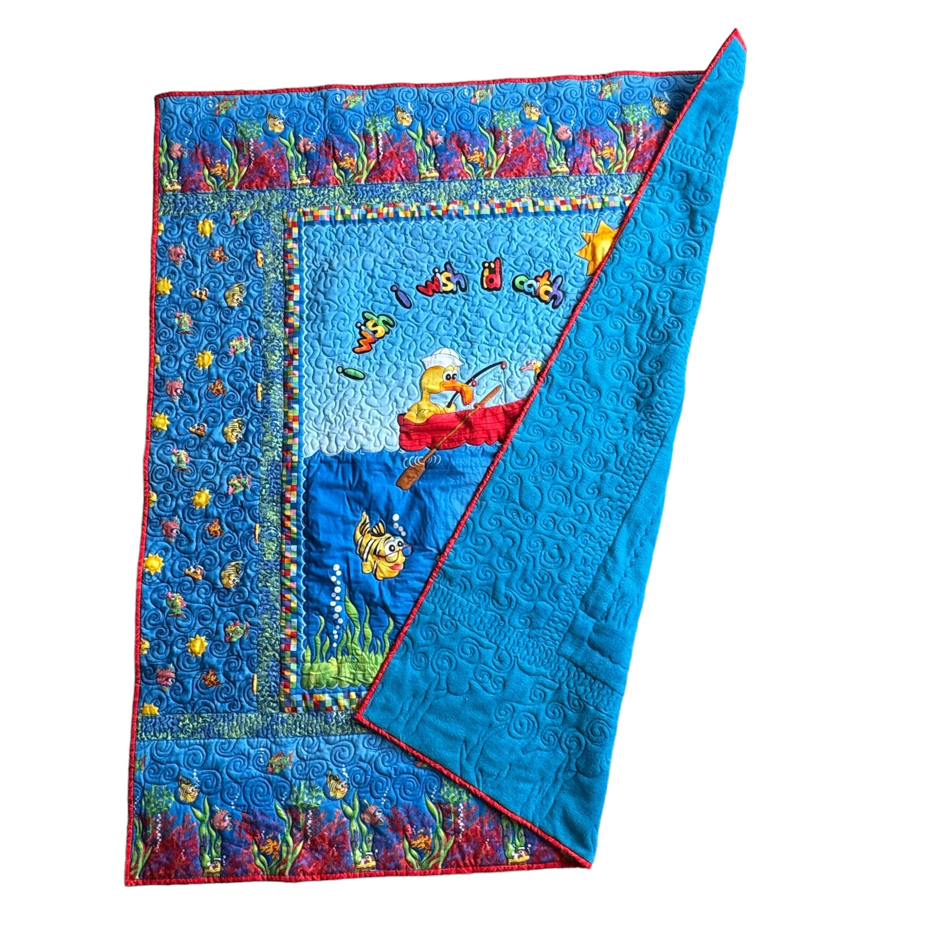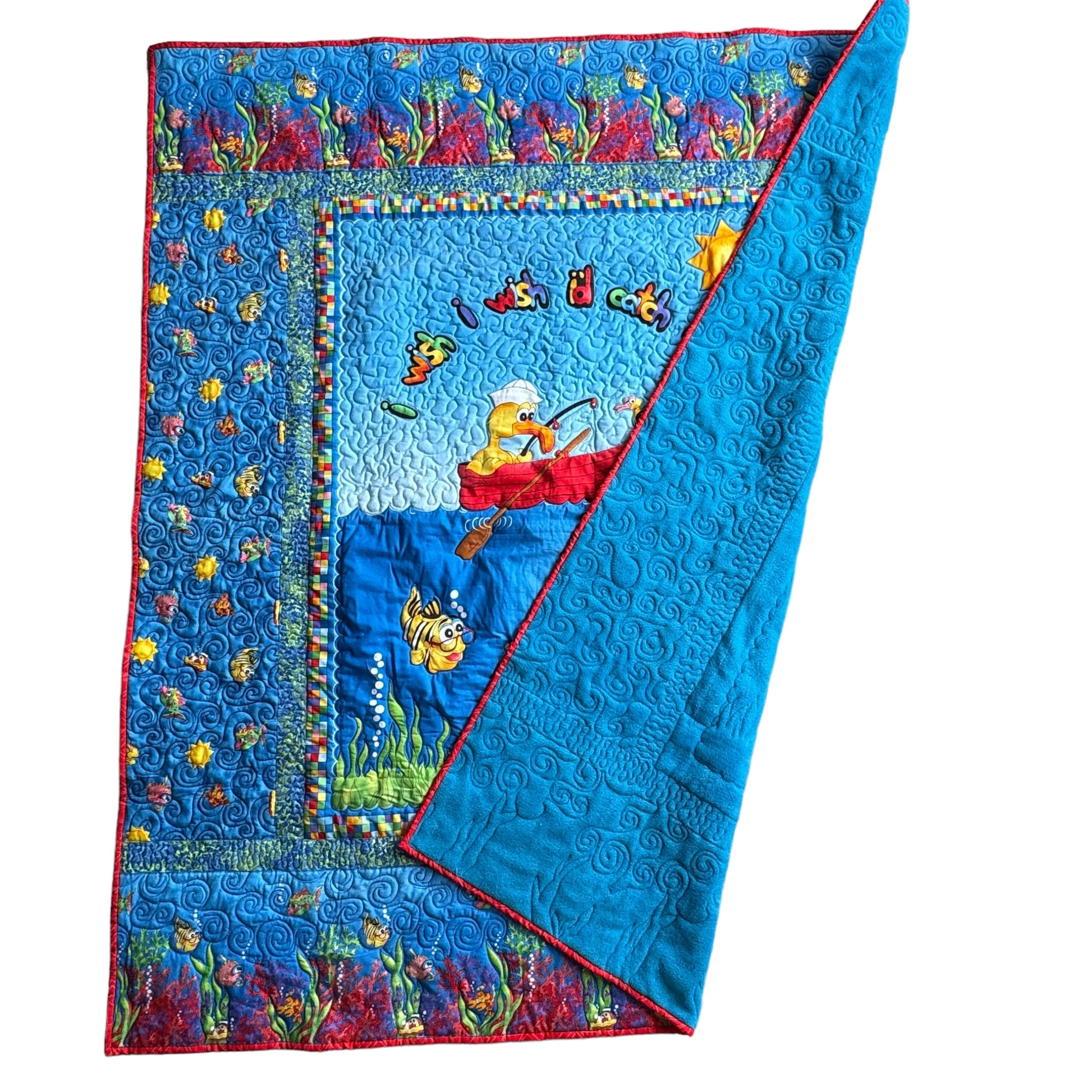 Image Description: A vibrant handmade quilt with a central ocean scene featuring a duck in a red canoe, fishing above cheerful sea creatures and green seaweed. The words “I wish I wish I’d catch a fish” are stitched in bright rainbow colours across the top. The quilt is framed with multicoloured checkered inner borders and wide blue outer borders with cartoon-style fish and coral reefs. Swirling quilting adds wave-like texture throughout. The backing is solid turquoise polar fleece, shown in one photo with a corner folded over, highlighting the soft texture and quilted swirl pattern. The quilt is edged with bright red binding.