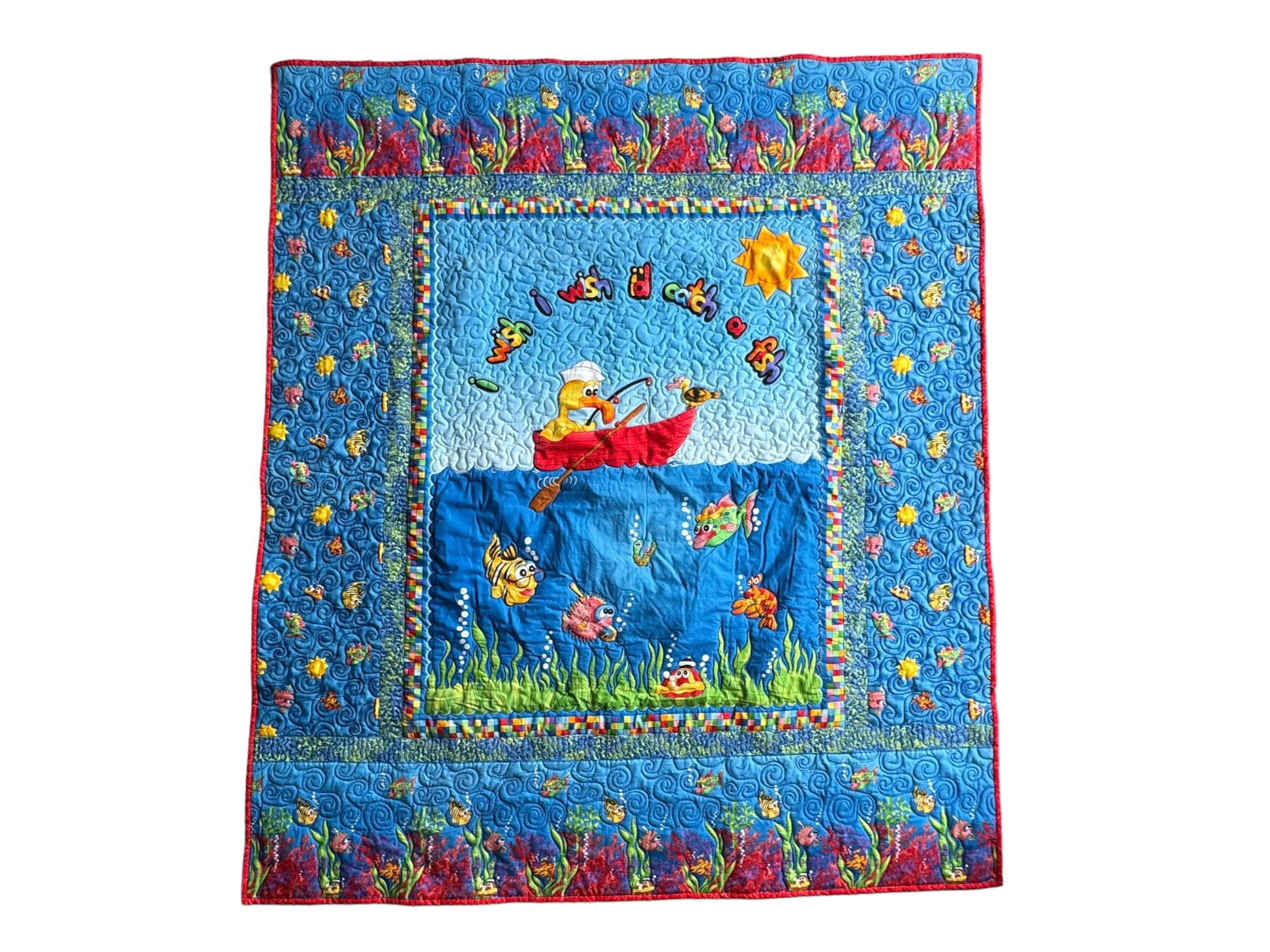 This playful ocean-themed quilt brings storybook charm to life with vibrant colours and whimsical detail. At the centre, a friendly duck in a red canoe sets off on a fishing adventure, with the phrase “I wish I wish I’d catch a fish” stitched above. The underwater world below is full of character, featuring smiling fish, seaweed, and bubbly quilting that mimics the movement of water.