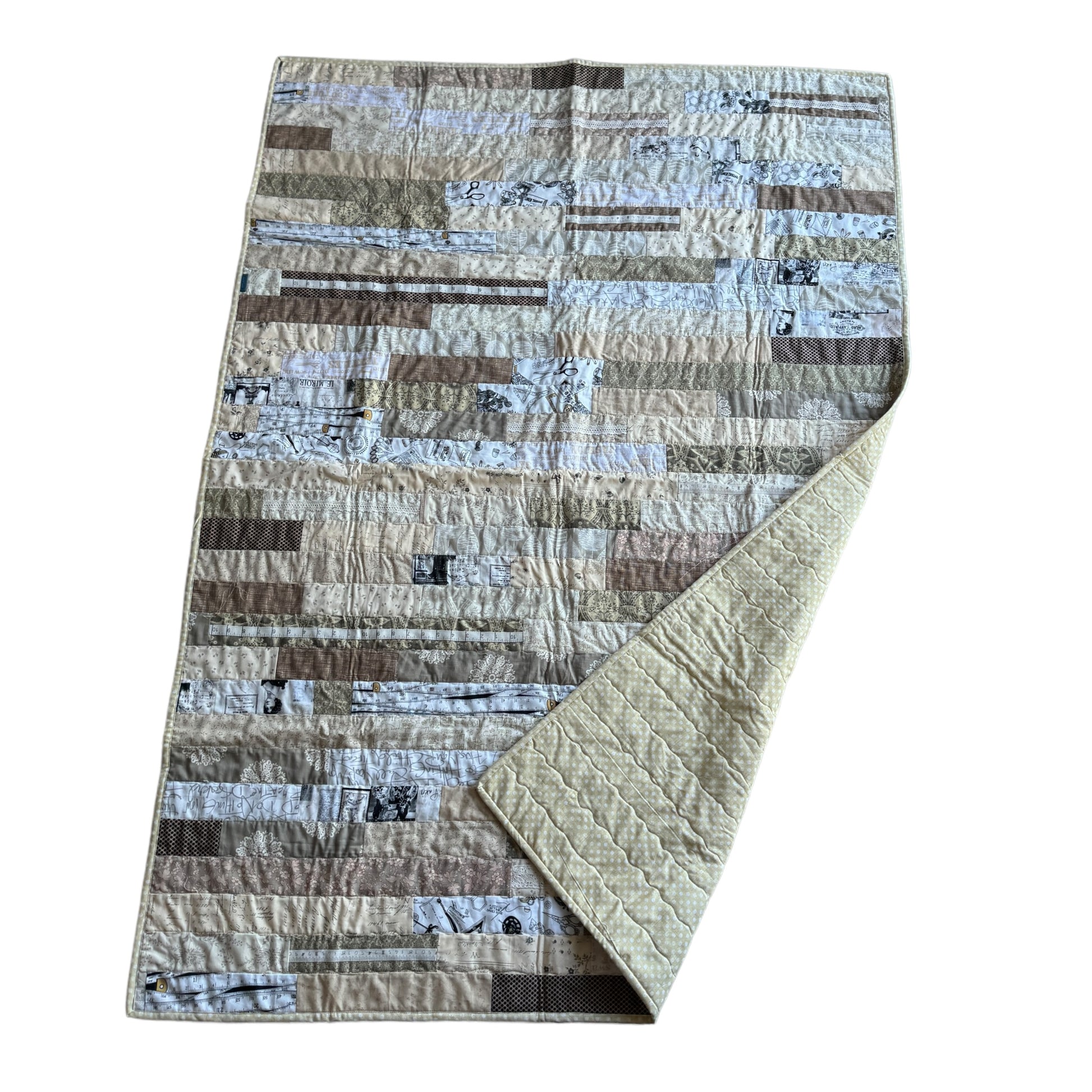 Image Description: A handmade quilt featuring horizontal fabric strips in soft neutral tones — including beige, taupe, brown, and grey — with a mix of solid, floral, and printed textures. The quilting is done in a gentle wave pattern across the entire surface. The reverse side is a light cream fabric with subtle detailing, visible in the folded corner. The overall look is soft, earthy, and minimalist.
