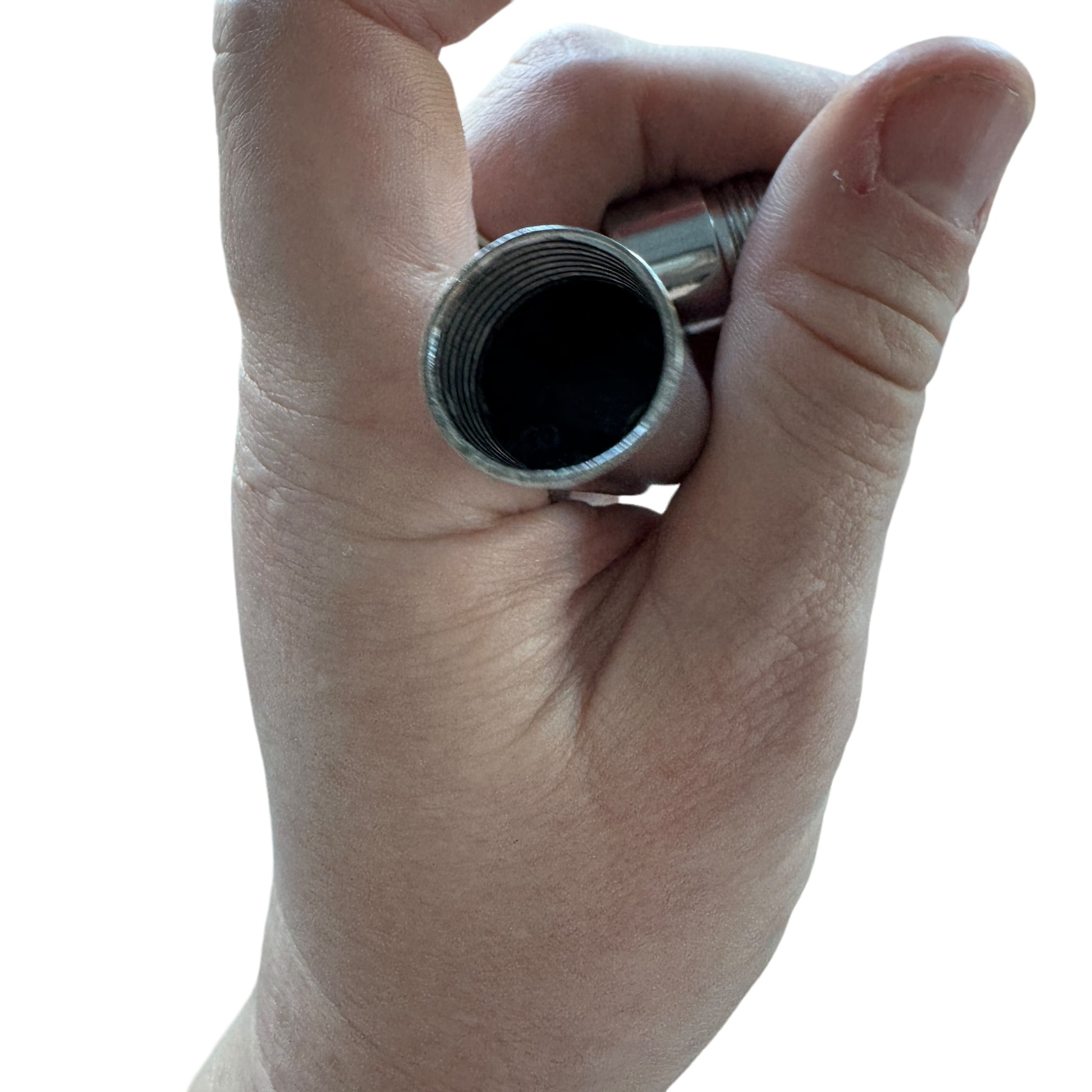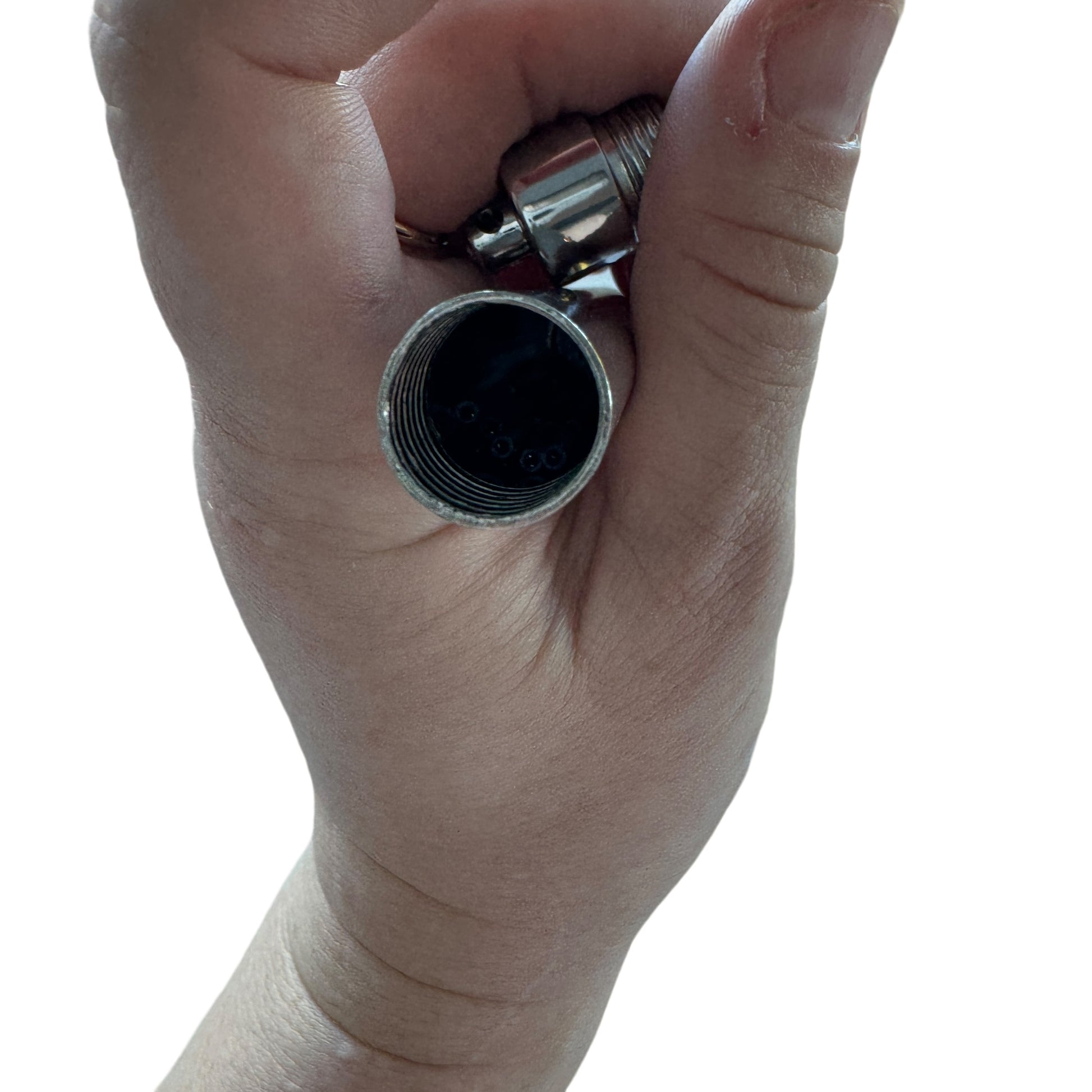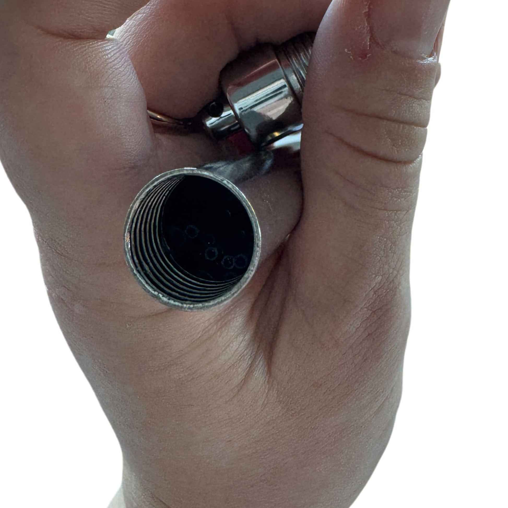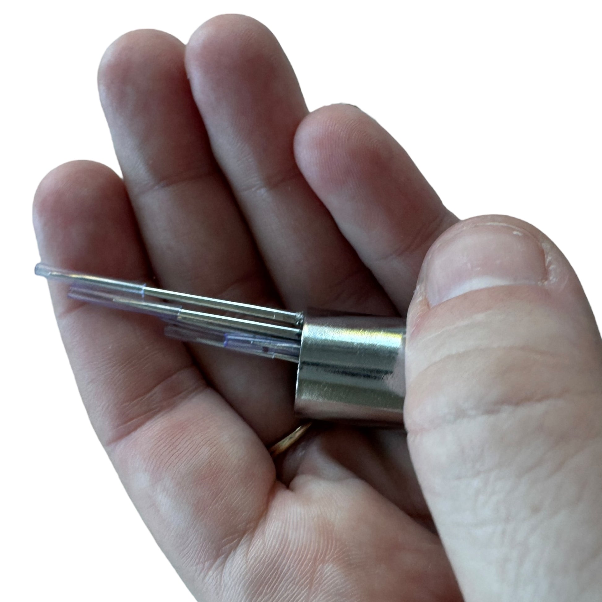 Image Description: A stainless steel travel tube sits alongside a set of slim denture sticks. Each stick is made of stainless steel with a textured grip at the one end for easier handling and a sharper tapered end at the other forming the toothpick end. The set includes 5x stainless steel dental sticks which all fit neatly inside the travel tube that functions as a key ring. The kit is compact, metallic and designed for easy everyday carry.