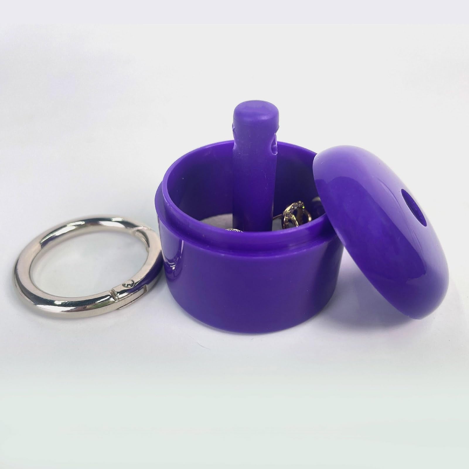 Image Description: A small round purple case attached to a silver keyring clip. The case opens to store small items like rings, earrings, or keepsakes, keeping them safe and easy to carry. Its bright purple colour makes it stand out, and the keyring allows it to be clipped to keys, bags, or zippers for quick access.
