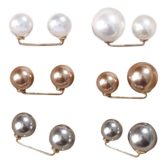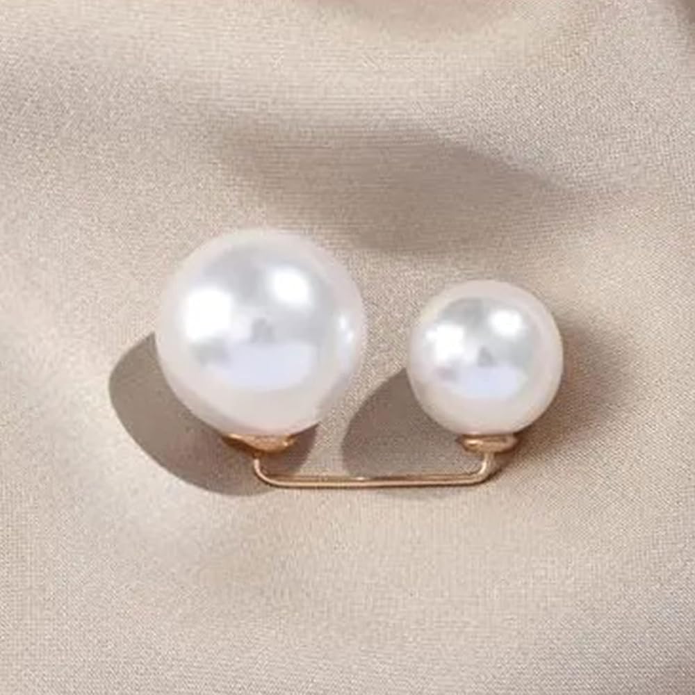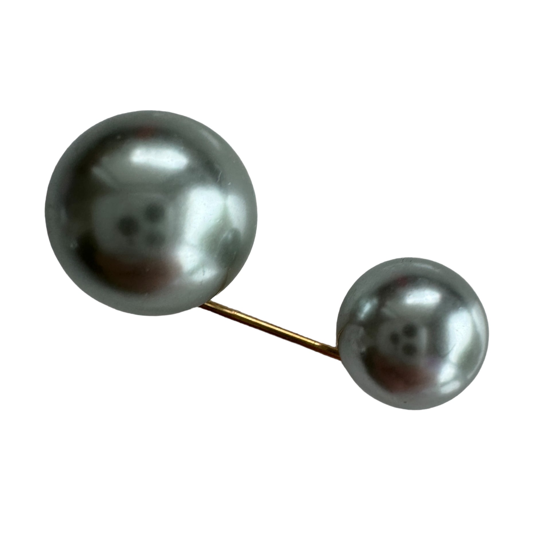 :  A clothing pin featuring two glossy faux pearls connected by a thin gold bar. One pearl is significantly larger than the other, creating a visually balanced design. The pin is compact and curved slightly, intended to slide through fabric for gathering or styling clothing.