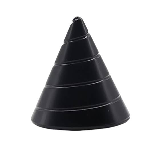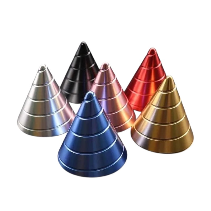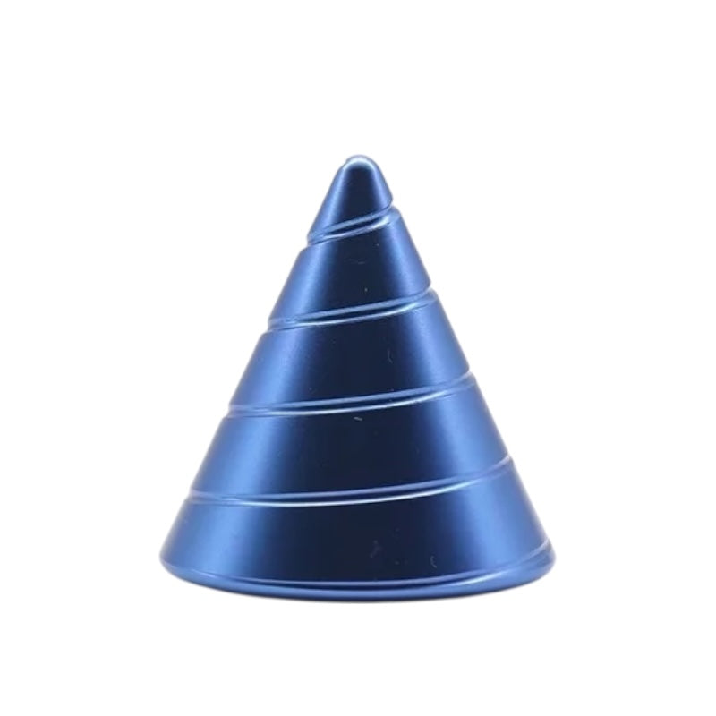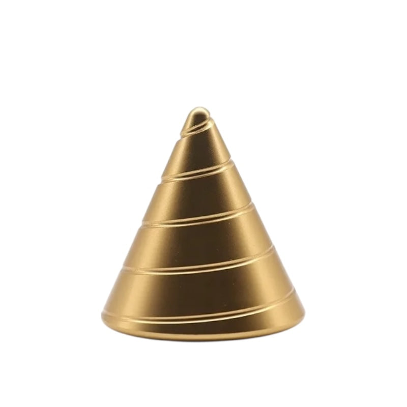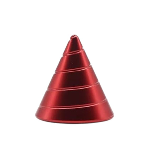 Image Description: A coloured metal pyramid with a spiral line that winds around from the top to the bottom so that as you spin it on itself it looks like it is spinning the line down, or up and creates a interest to capture your attention and distract as a sensory need.