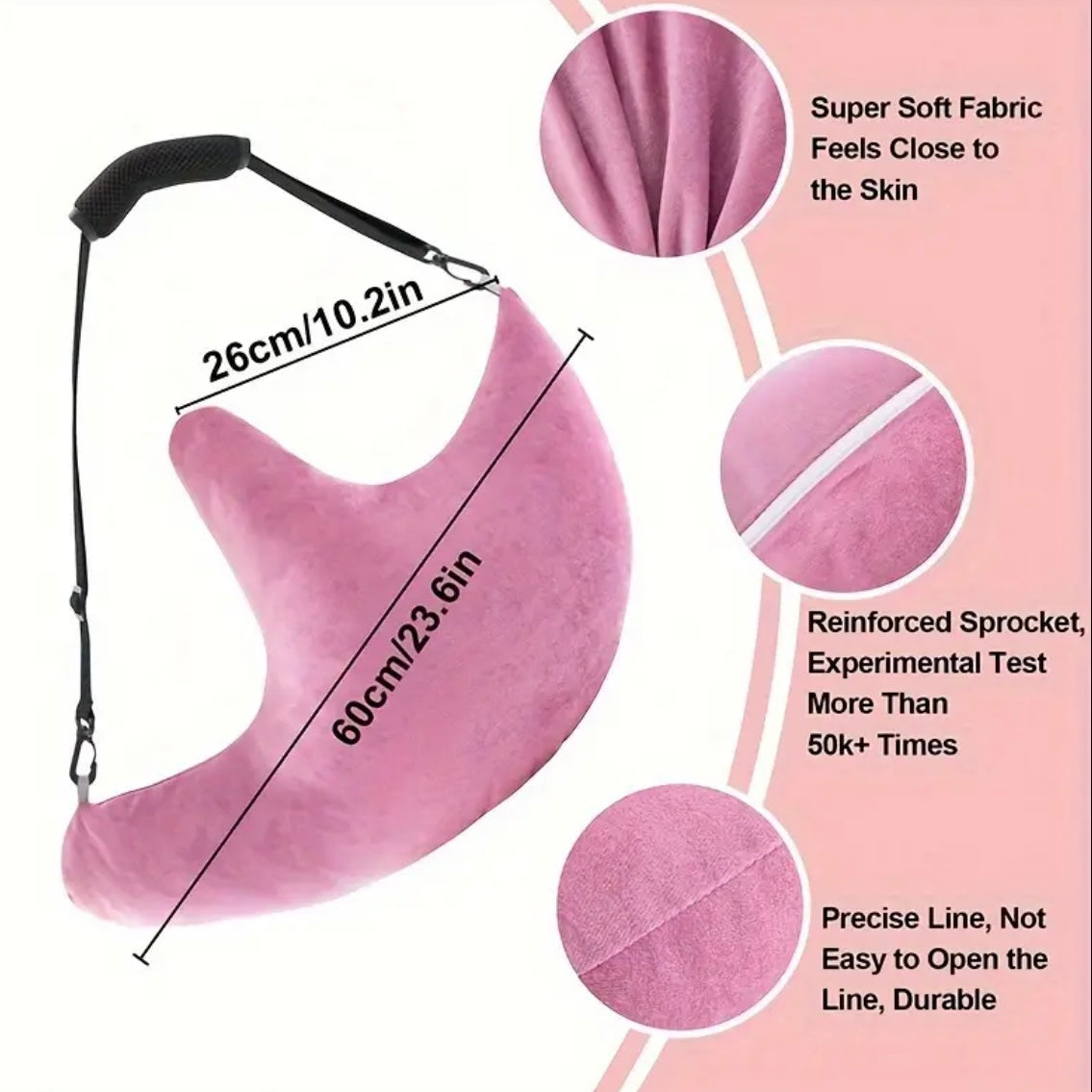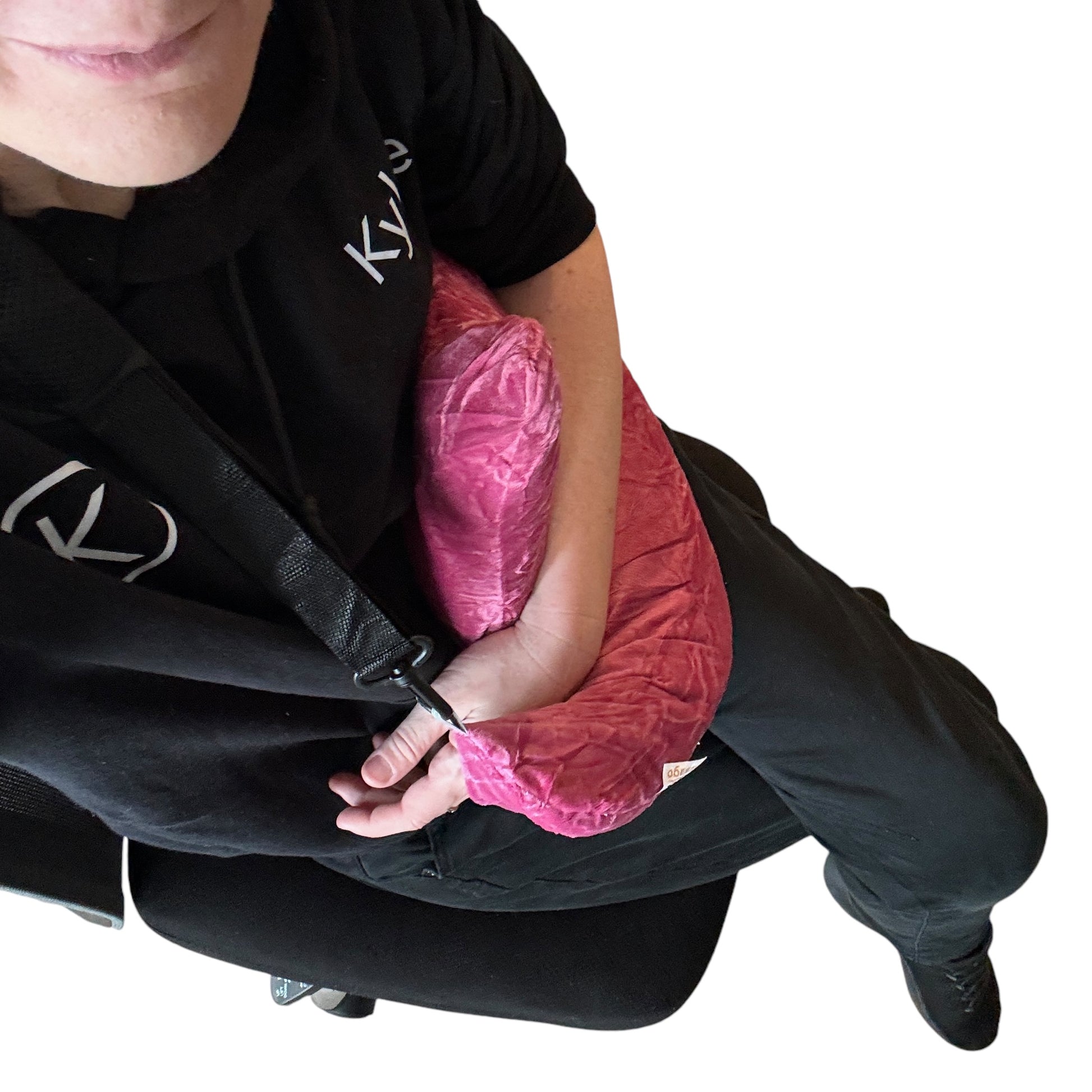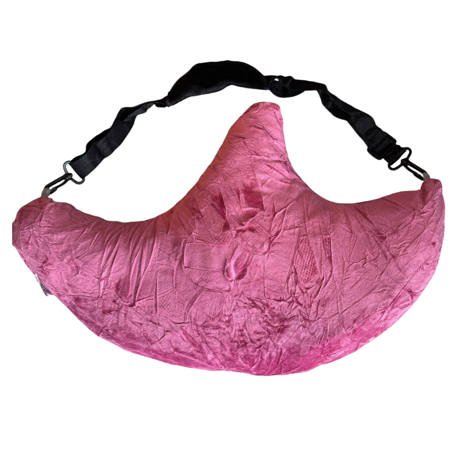 Image Description: A bright pink, crescent-shaped pillow made from soft, crinkled plush fabric. The pillow has an adjustable black strap attached to each end with clips, designed to help position or carry the pillow. The pillow’s shape curves gently upward in the centre, creating a supportive area for resting an arm or shoulder.