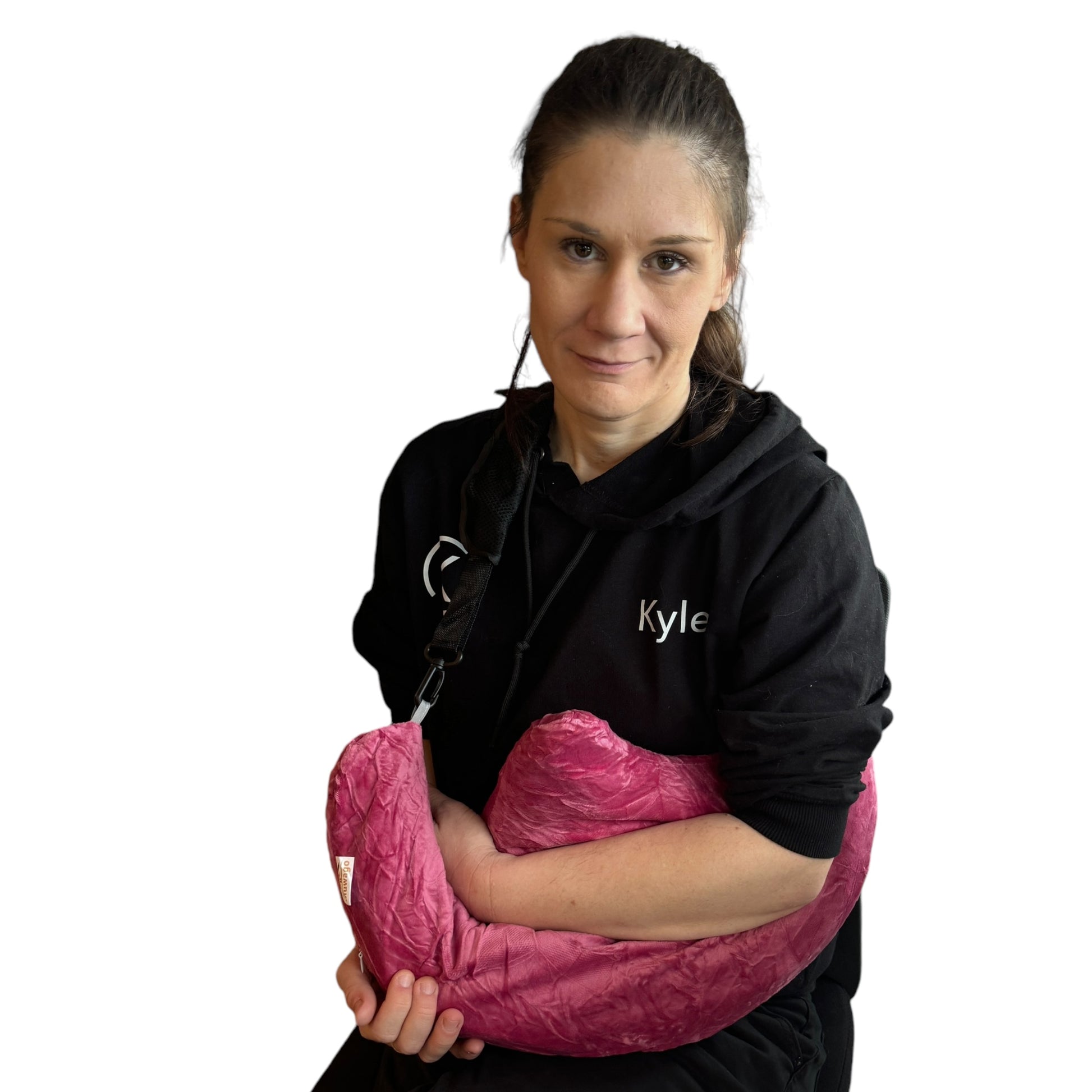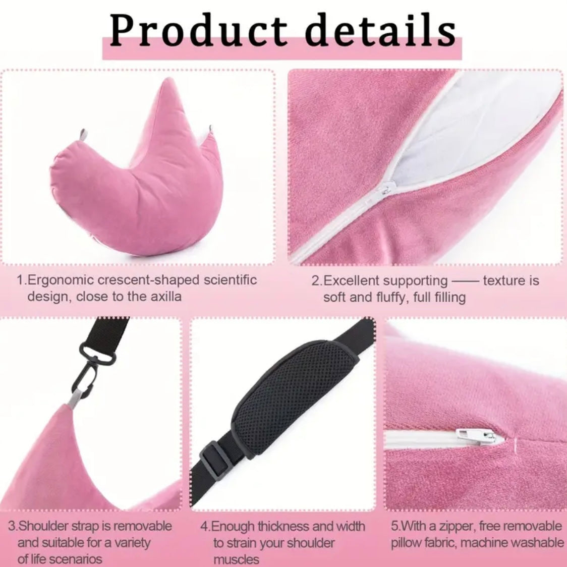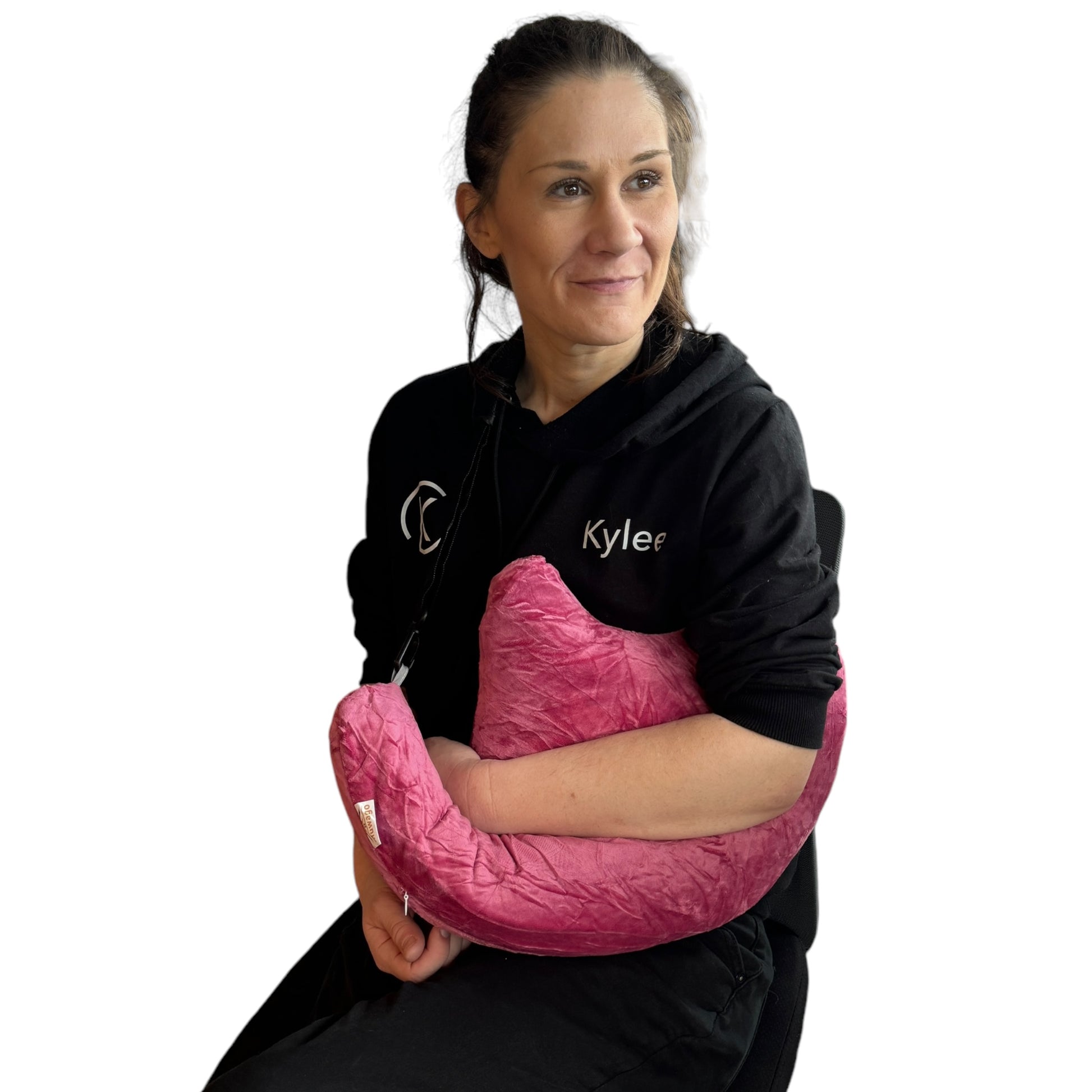 Image Description: A bright pink, crescent-shaped pillow made from soft, crinkled plush fabric. The pillow has an adjustable black strap attached to each end with clips, designed to help position or carry the pillow. The pillow’s shape curves gently upward in the centre, creating a supportive area for resting an arm or shoulder.
