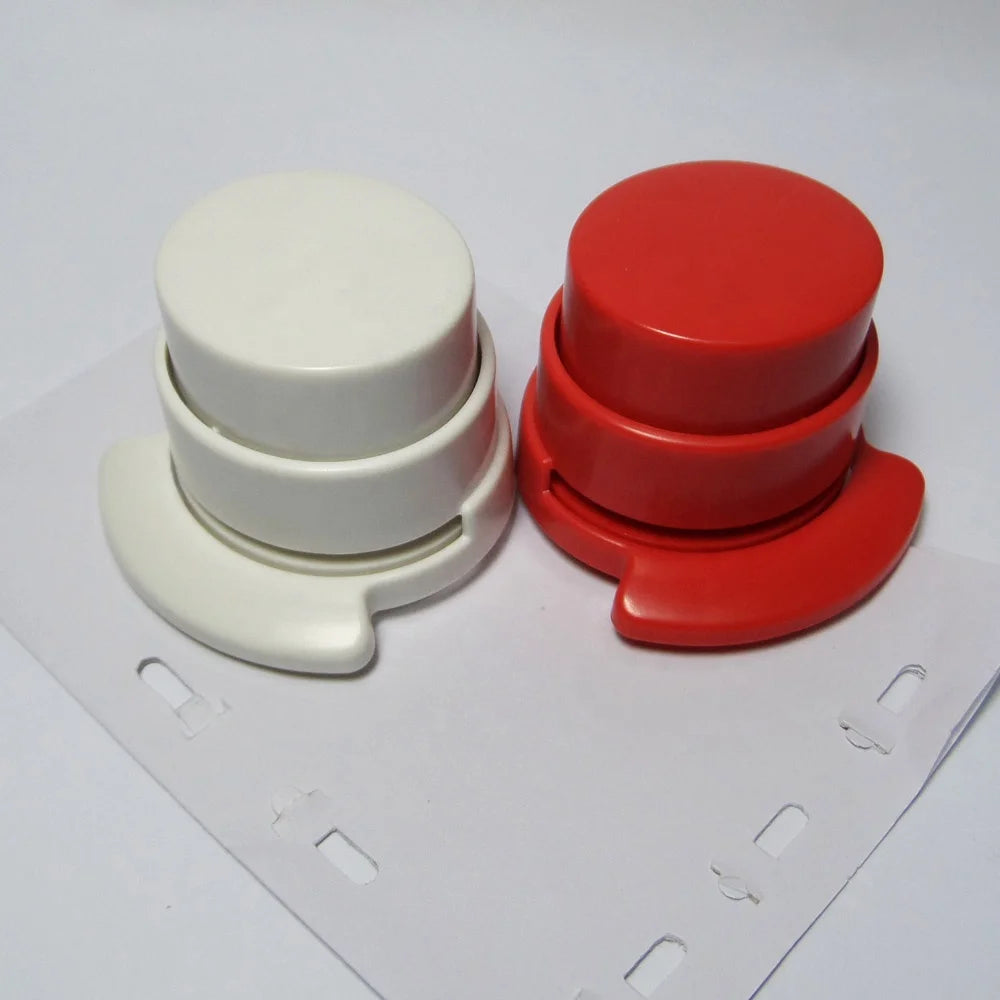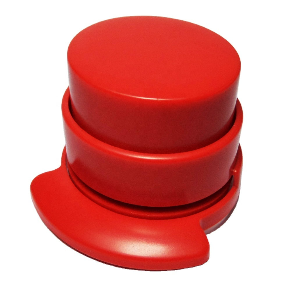 Image Description: A compact, round-style staple-free stapler shown in assorted colours including red, yellow, white, and black, with a smooth, easy-press top and stable base, displayed from multiple angles to show size and shape.