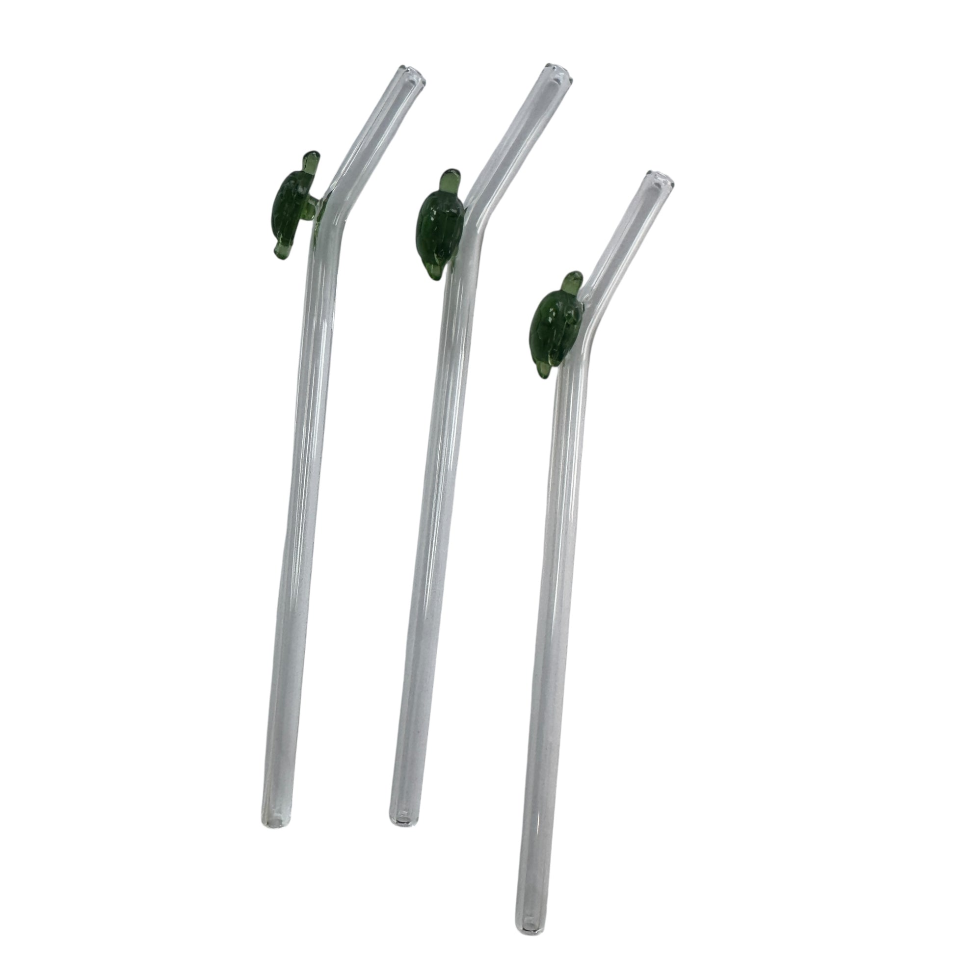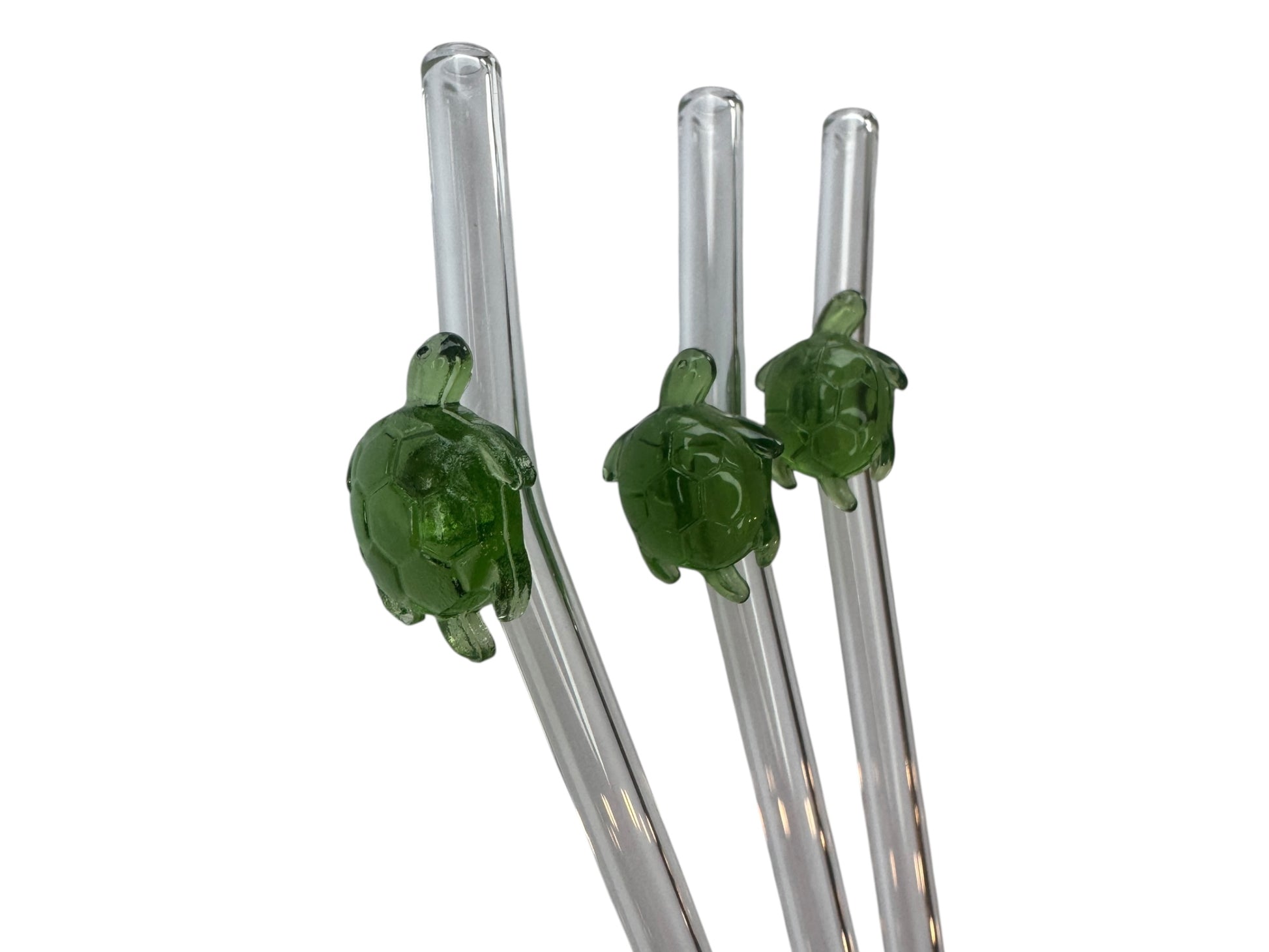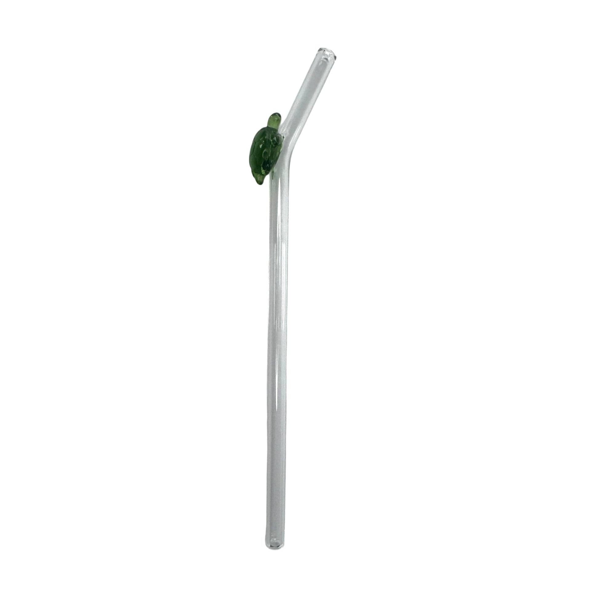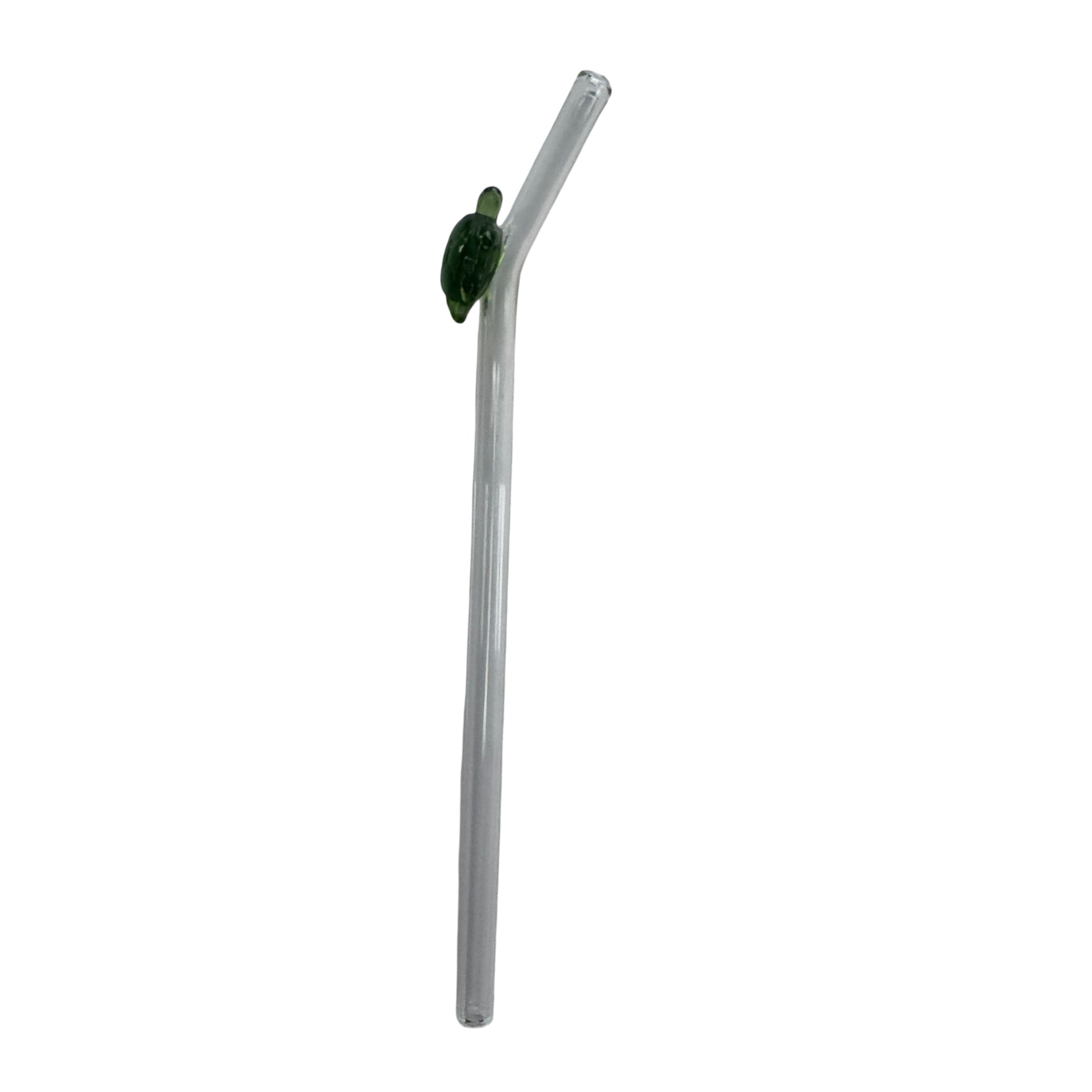 Image Description:  A clear glass straw with a small glass green turtle design near the top.
