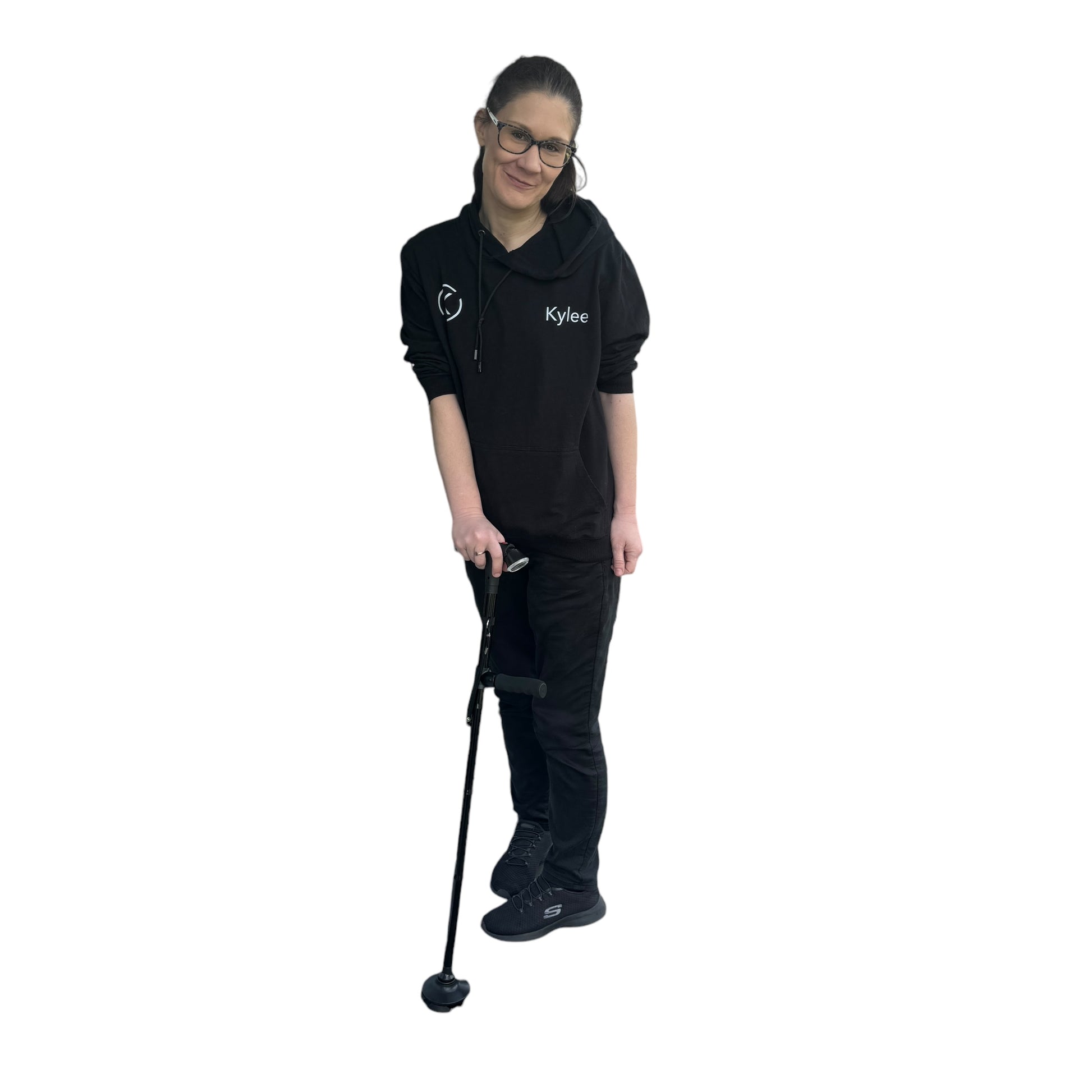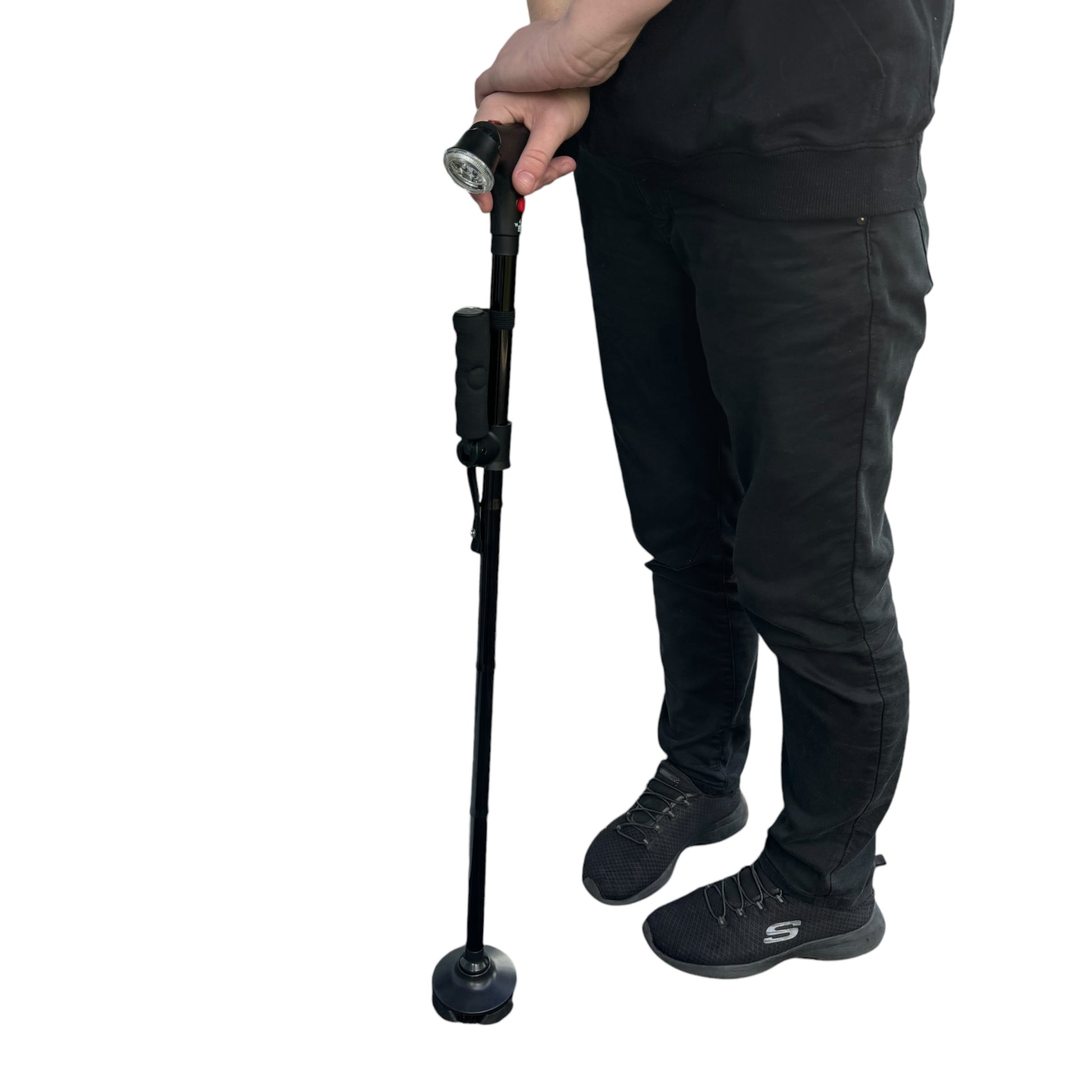 Made with aluminium & ABS plastic, this walking stick is a good quality, easy to use, stable and supportive walking stick with its 4-feet stand alone base 360° rotated base with anti skid is fit for types of walking paths. With its LED light to light your path, it’s alarm to keep you feeling safe and secure, it’s additional fold up handle to make getting up easier, AND it’s 5 levels of adjustment at the click of a button — this stick is made for ease + convenience at it’s finest!