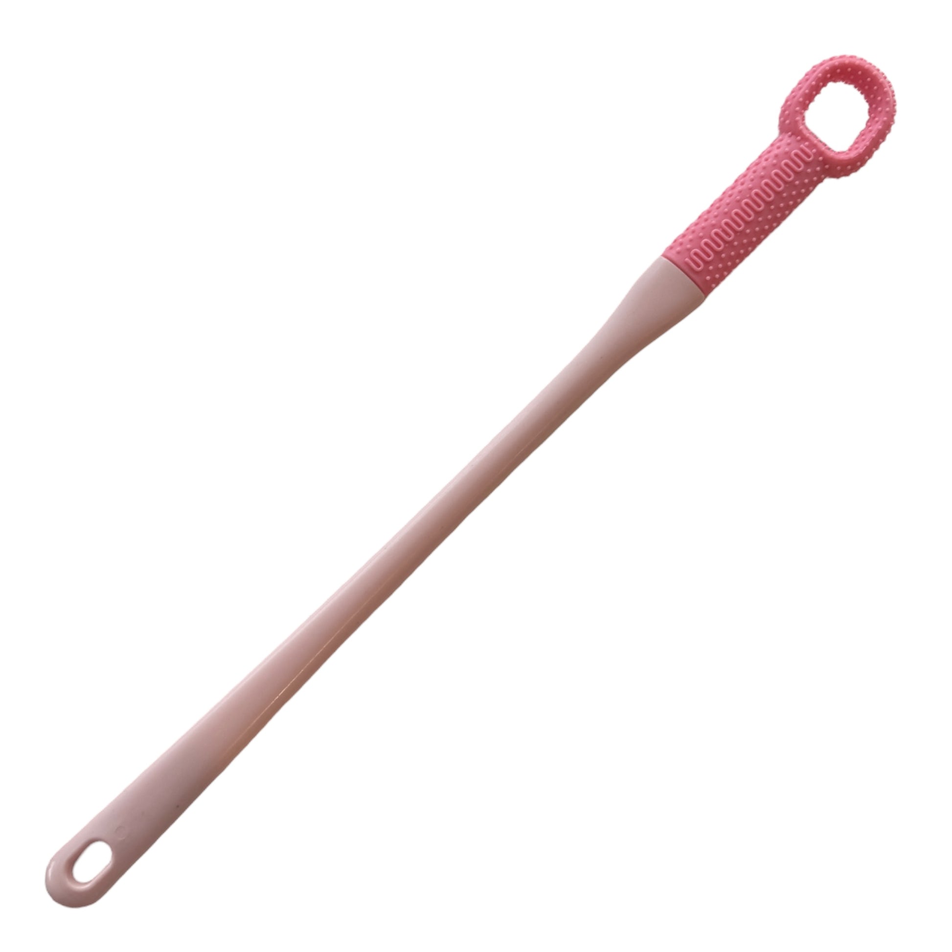 Image DescriptionA long, slim beige handle with a pink textured loop at the top for cleaning toes. The handle has ridges to make it easy to hold, and there’s a small hole at the bottom for hanging it up. Simple and lightweight, perfect for everyday use.