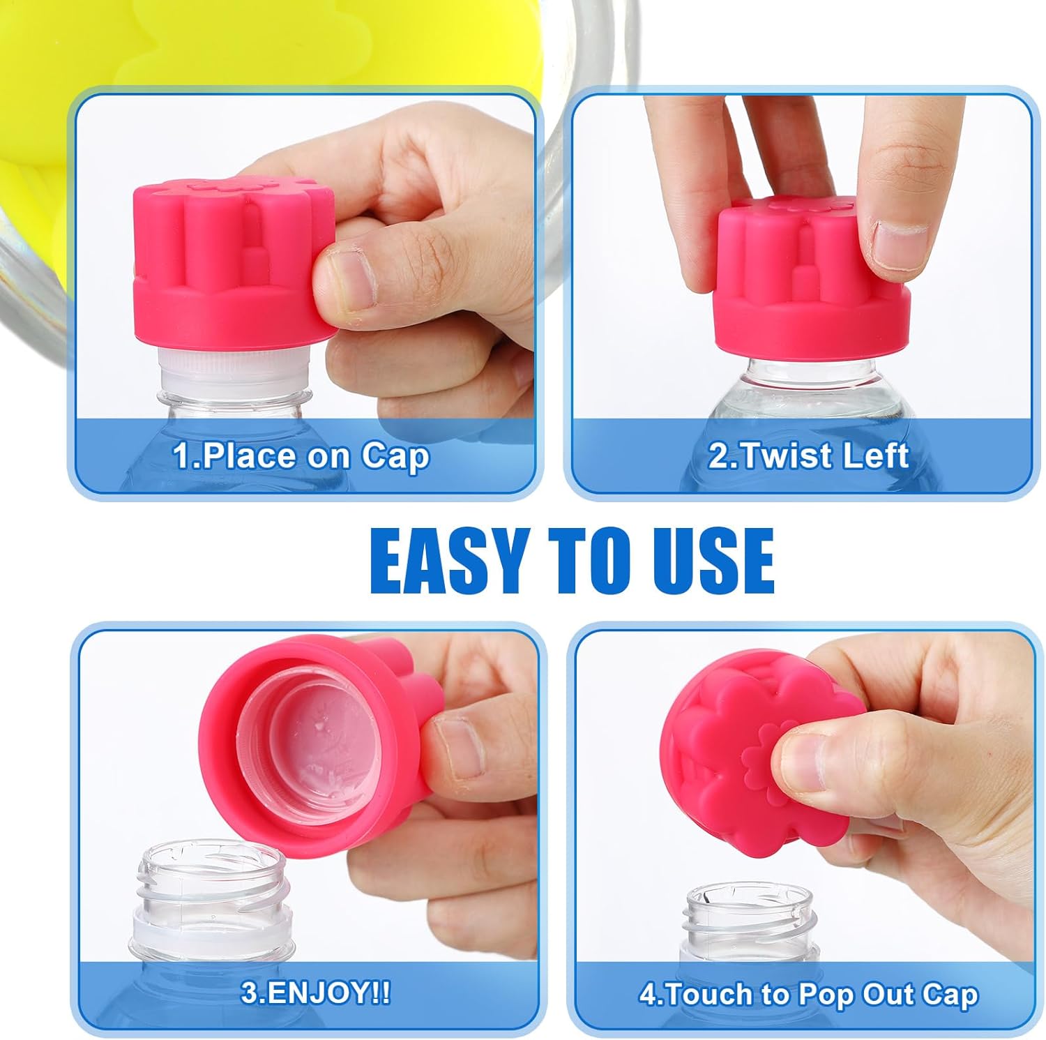 Image Description: Bright pink and yellow silicone flower shaped bottle cap openers shown on a white background. One image shows a hand using a pink opener to twist open a drink bottle.