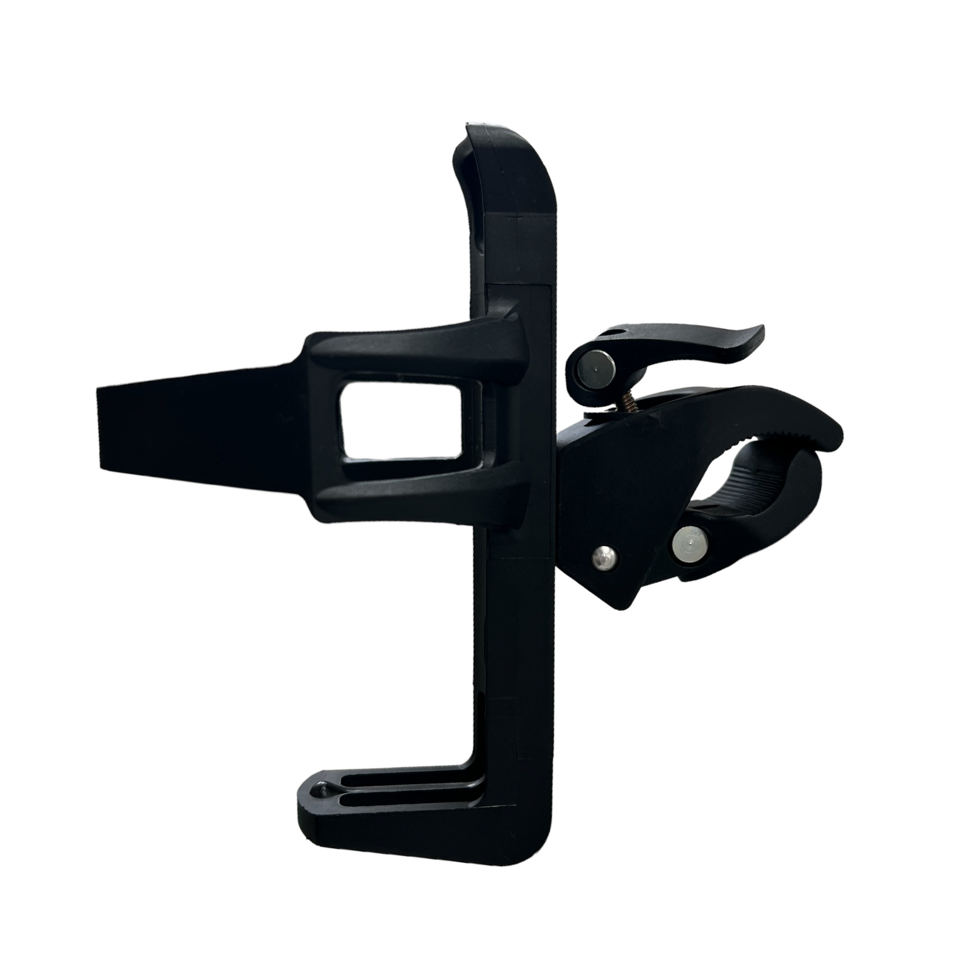 These bottle holders will connect and clamp onto any mobility device that you would like to attach it to. Fit it to the angle you would like to set it at, and tighten the clamp. It will hold in place to carry your water bottle.