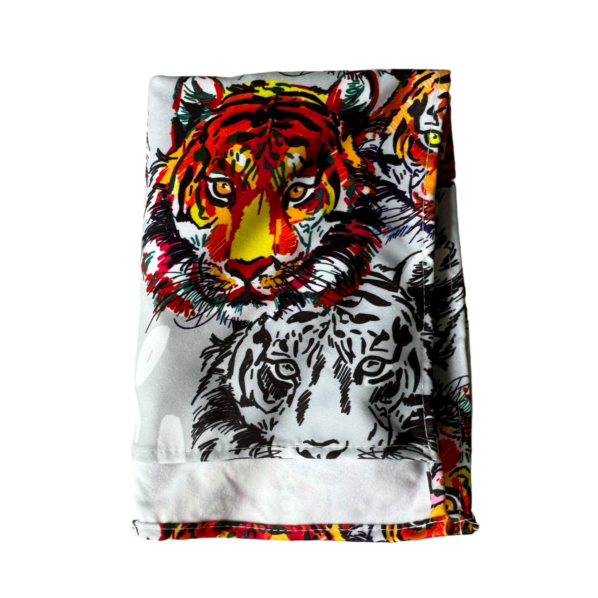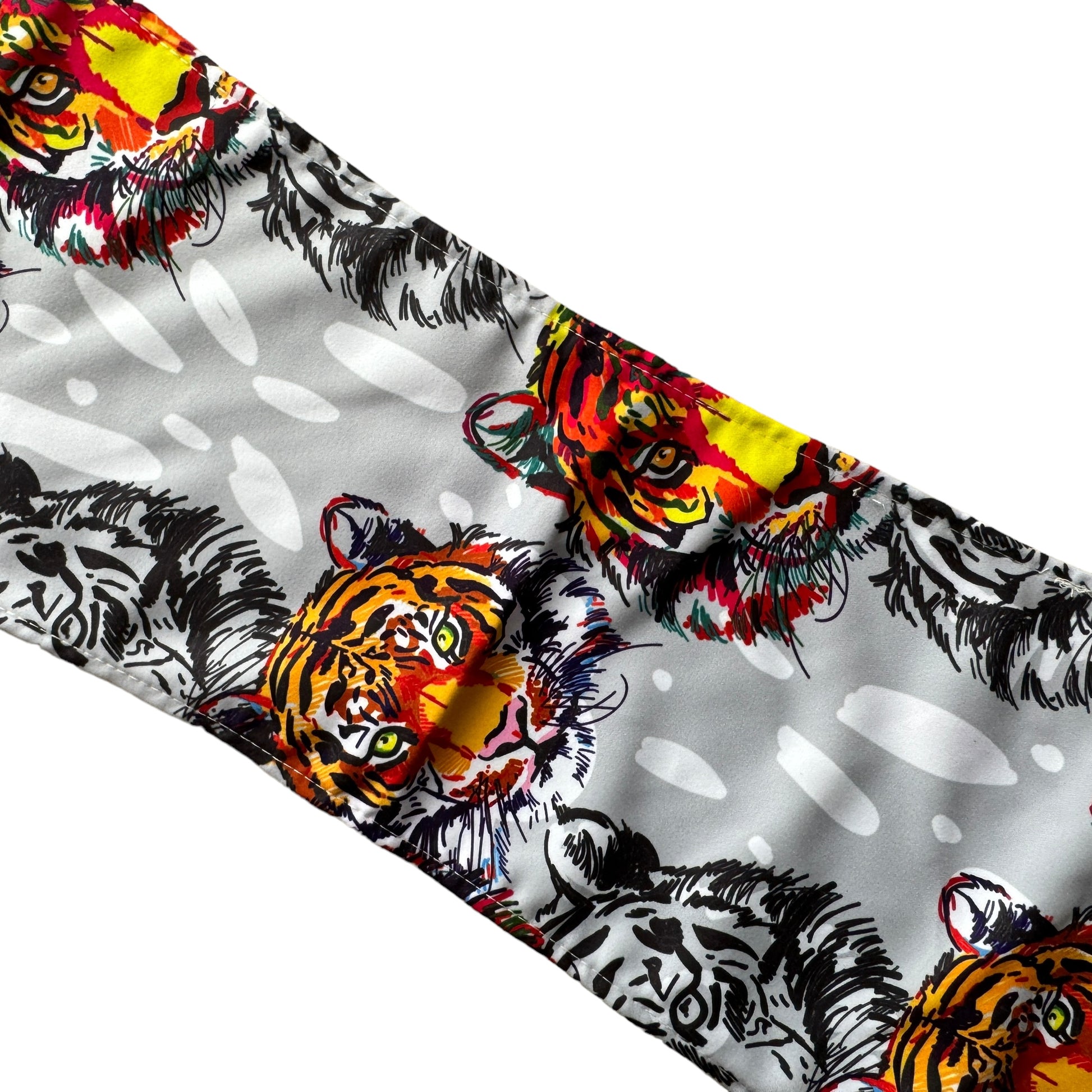 Image Description: This material features a repeated tiger face print in black and white with tigers in bright burnt orange and yellow as features in the print. The background is a light grey with added white splotches.
