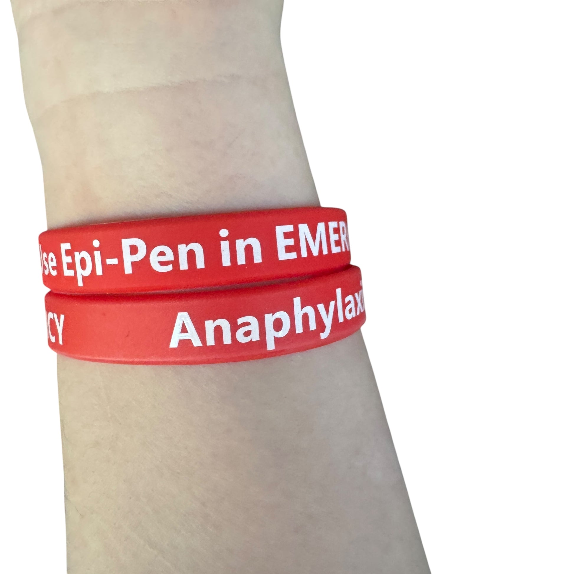 Image Description: A red silicone wristband with bold white lettering that reads: “Anaphylaxis Alert – Use EpiPen in Emergency.” The band is shown looped and stacked for visibility of the message.
