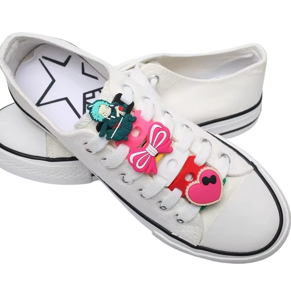 Each soft silicone piece has a snug centre port that fits standard Jibbitz style charms and slides easily over flat shoelaces.