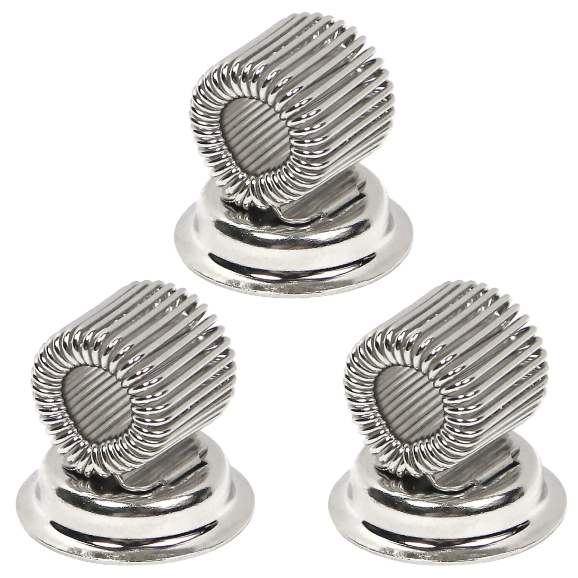 Image Description: A silver magnetic pen holder made from metal. It has a flat round magnet on the bottom and a raised loop on top. The loop is made from closely spaced curved metal wires that form an oval shaped opening where a pen can be inserted. The surface is shiny and smooth.