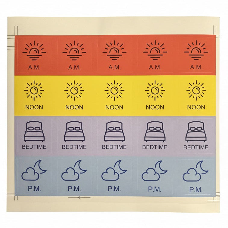 Never miss a dose again with our Medication Container Reminder Stickers! These cheerful, easy-to-use stickers are your new best friend when it comes to staying on top of your health routine. Simply peel and stick them onto your medication containers to create instant visual cues for A.M., noon, P.M., and bedtime doses. Perfect for busy schedules, forgetful moments, or anyone managing multiple medications, these stickers transform your medicine cabinet into a friendly reminder system. Colour-coded and clearly labelled, they make it impossible to mix up your timing. Whether you're juggling work, family, or just life's chaos, these little helpers keep you accountable and your health on track. Make medication management less of a chore and more of a breeze!